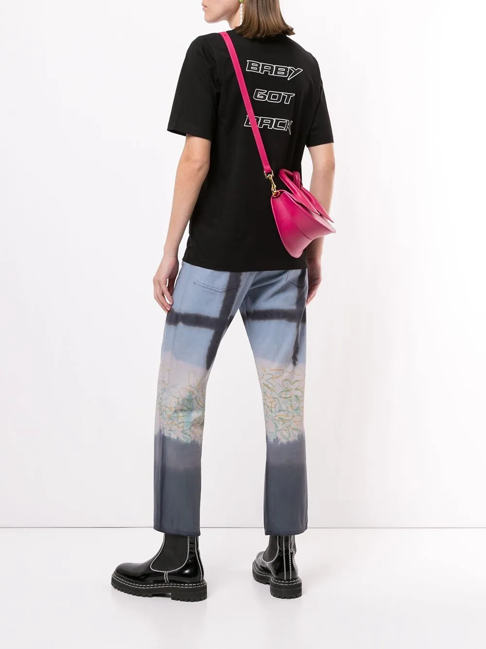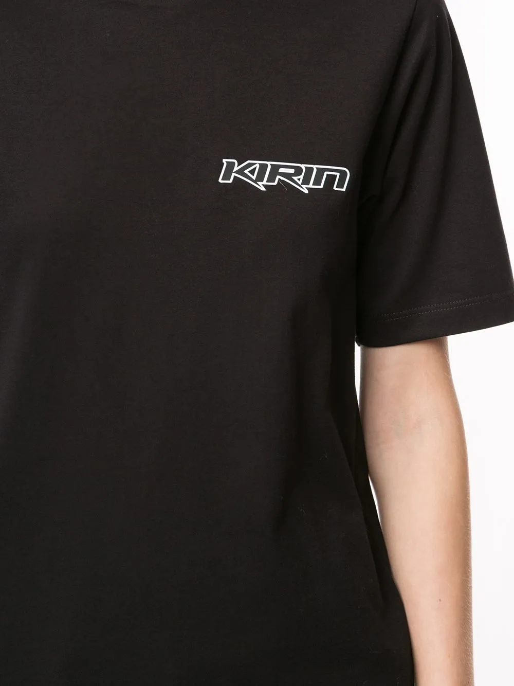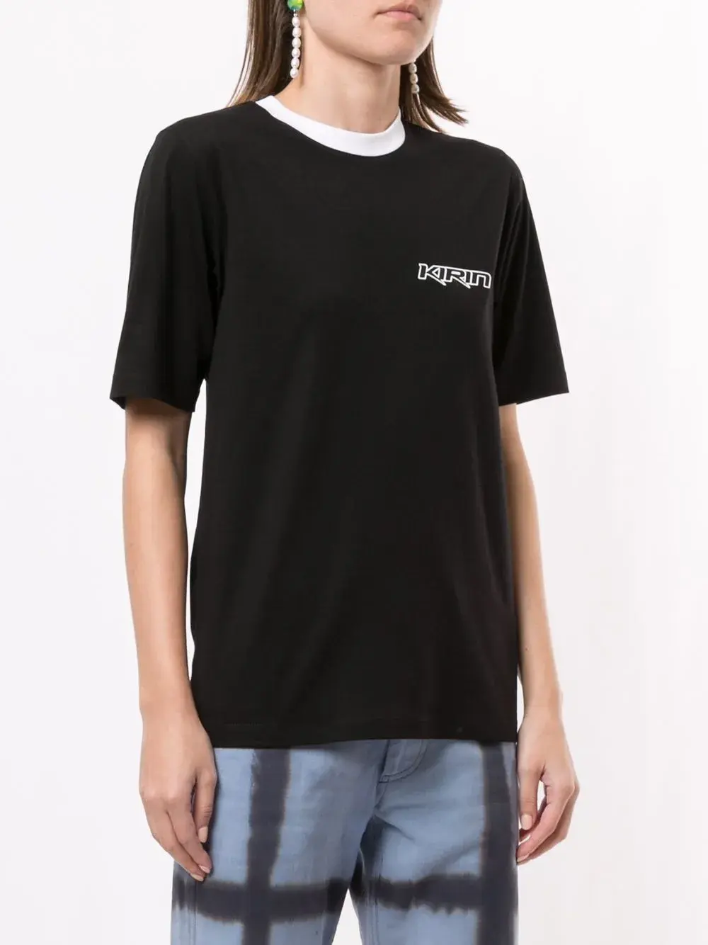 Круглый вырез, контрастная отделка, логотип спереди, принт с надписью сзади и короткие рукава.