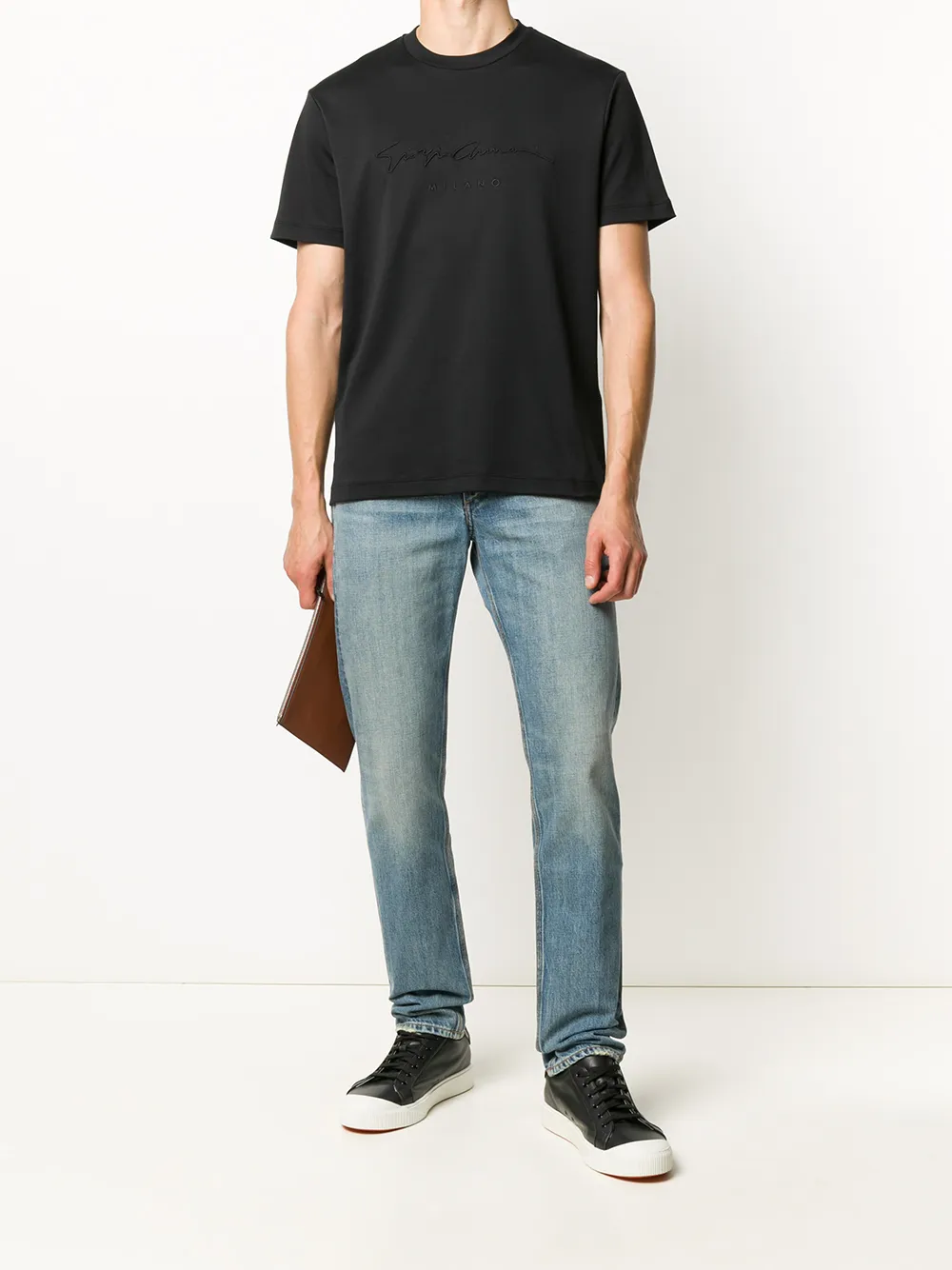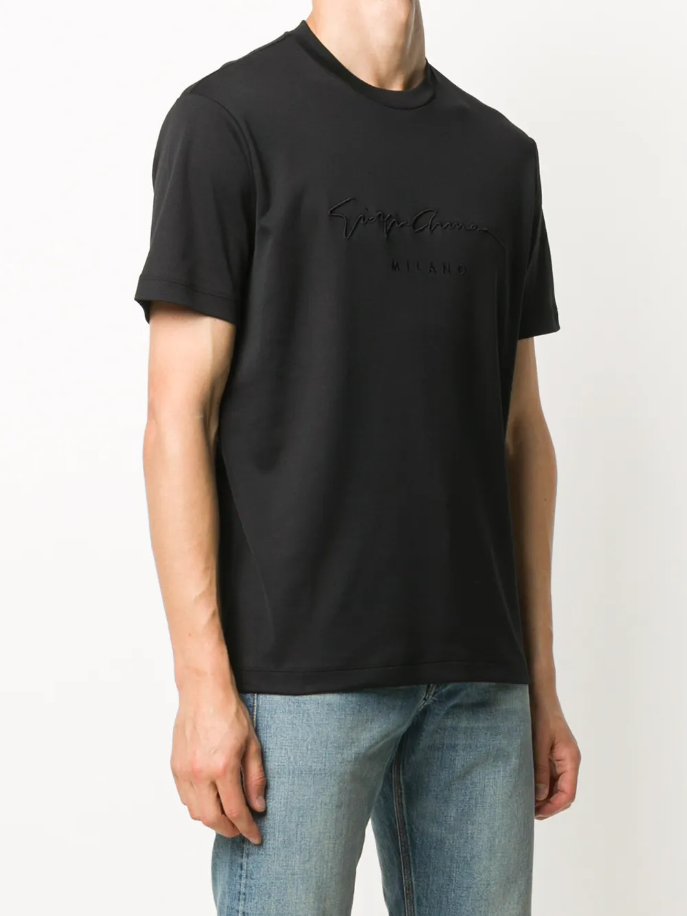 Футболка с вышитым логотипом от Giorgio Armani (Джорджо Армани). Круглый вырез, короткие рукава и прямой подол. Цвет: черный.