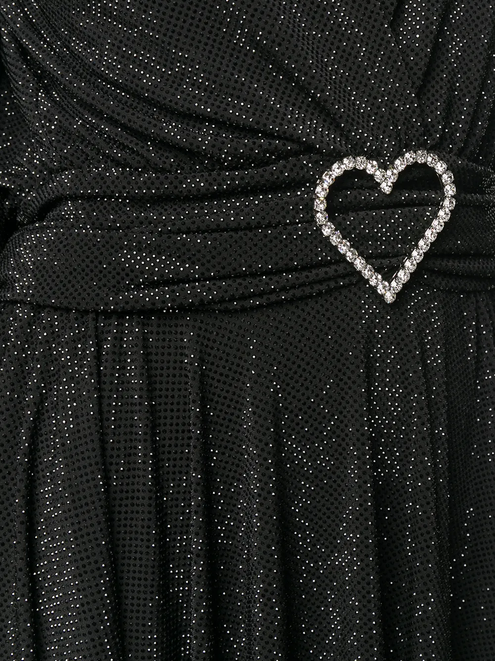 Глубокий V-образный вырез, драпированная юбка, длинные рукава и подвеска в форме сердца.