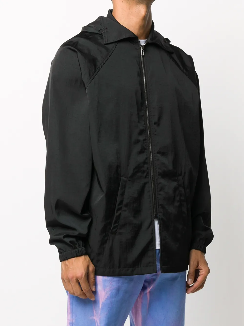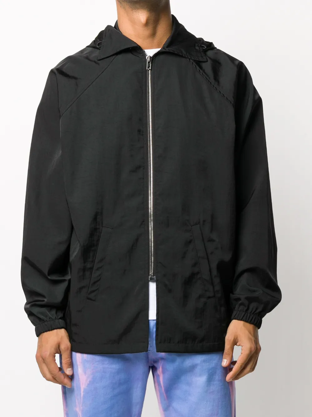 Затягивающийся на шнурок капюшон, косой воротник, застежка на молнии спереди и длинные рукава реглан.