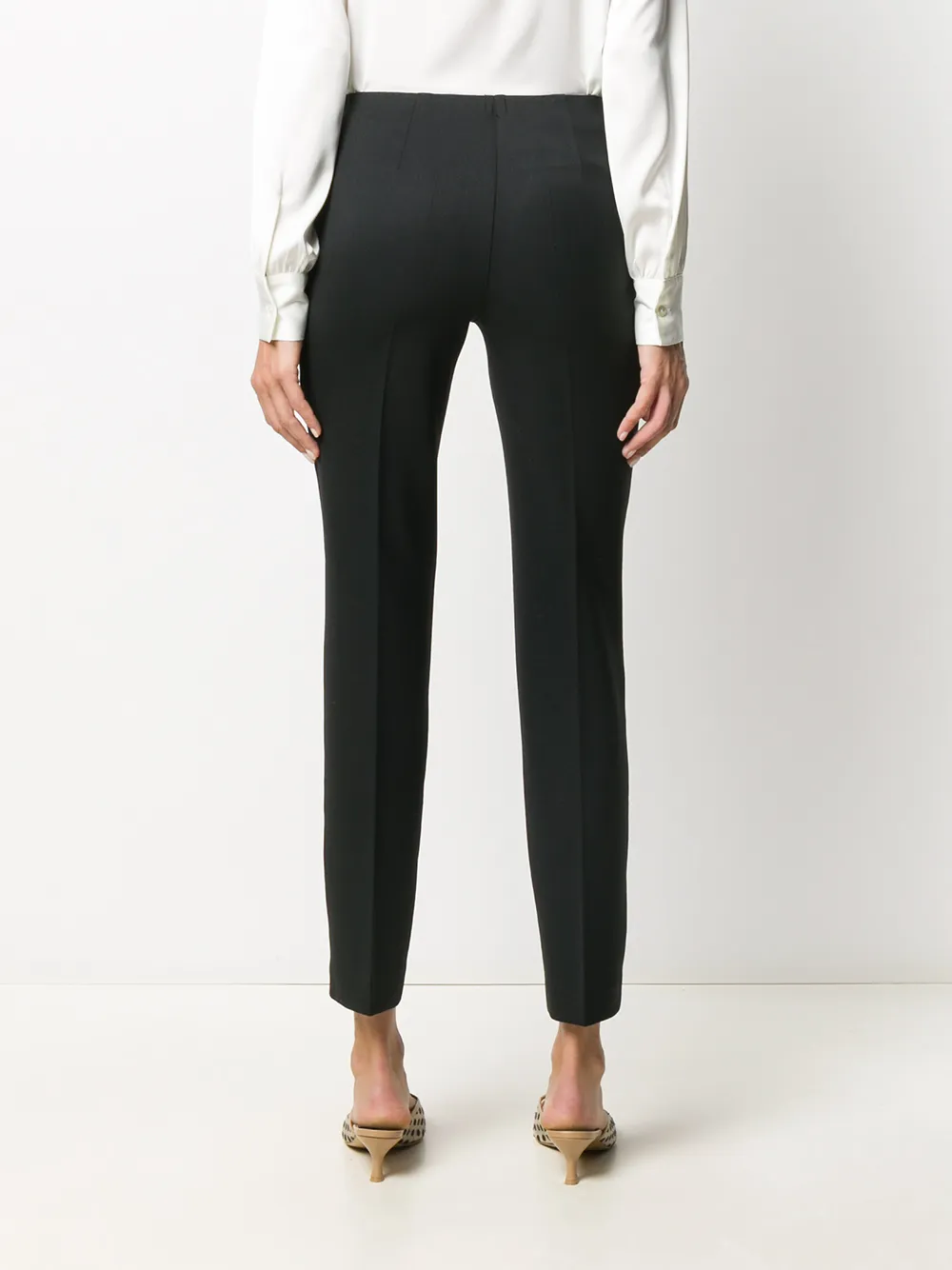 Тональная строчка, средняя посадка, длина по щиколотку и узкий крой. Цвет: черный.