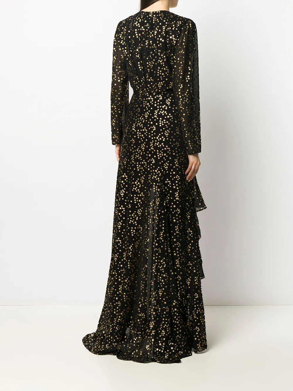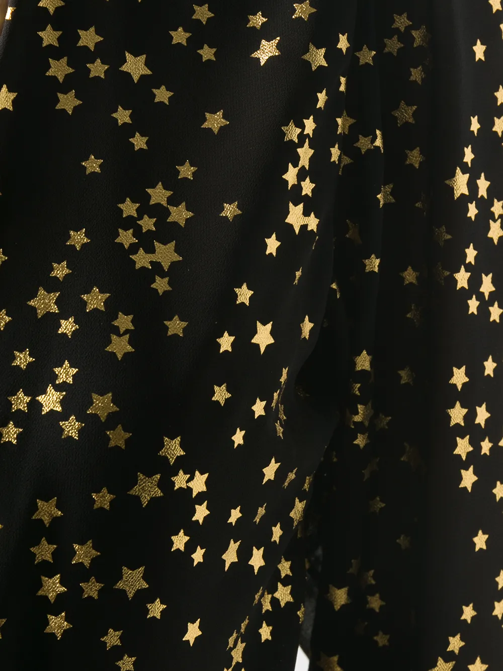 Прозрачные вставки, принт с изображением космоса, вставки с оборками, декор в виде узла, глубокий V-образный вырез, длинные рукава и неравномерный подол.