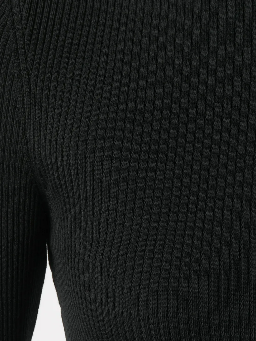 Трикотаж в рубчик, облегающий крой, высокое горлышко с заворотом и длинные рукава. Цвет: черный.