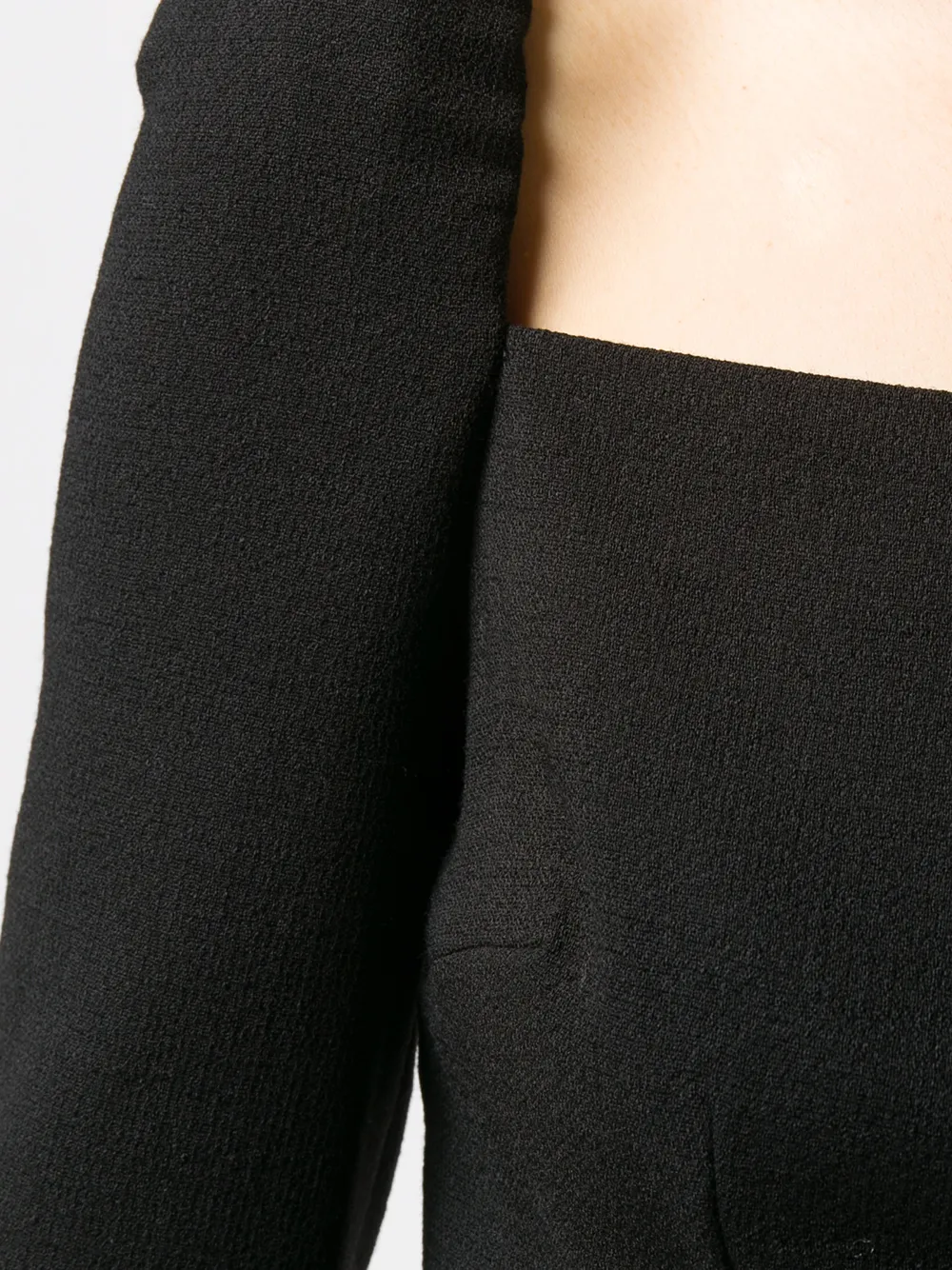 Квадратный вырез, рукава три четверти и застежка на молнии сзади. Цвет: черный.