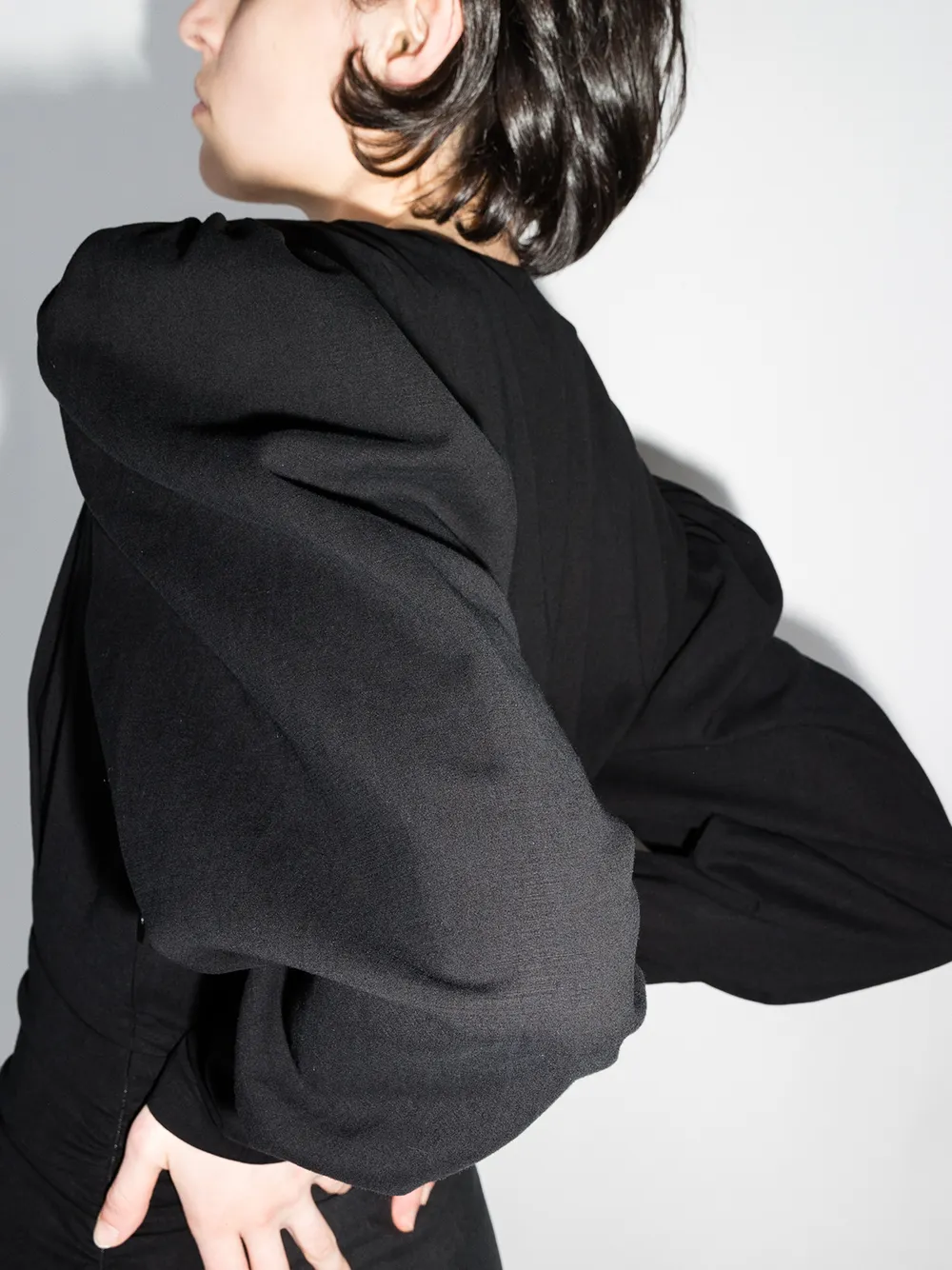 Объемные рукава, глубокий V-образный вырез и потайная застежка сбоку. Цвет: черный.