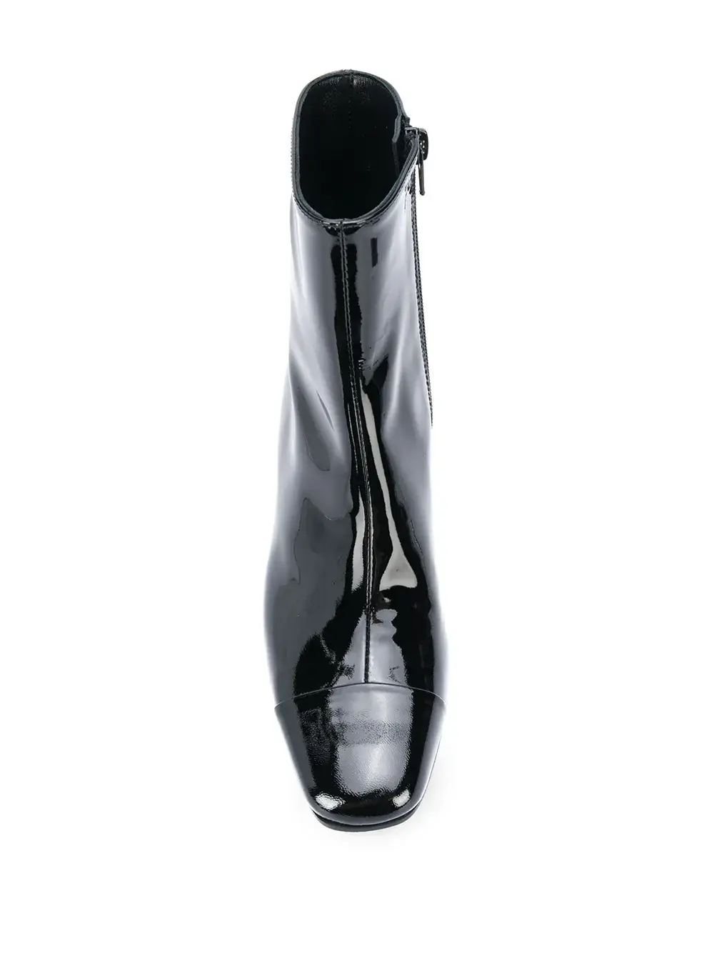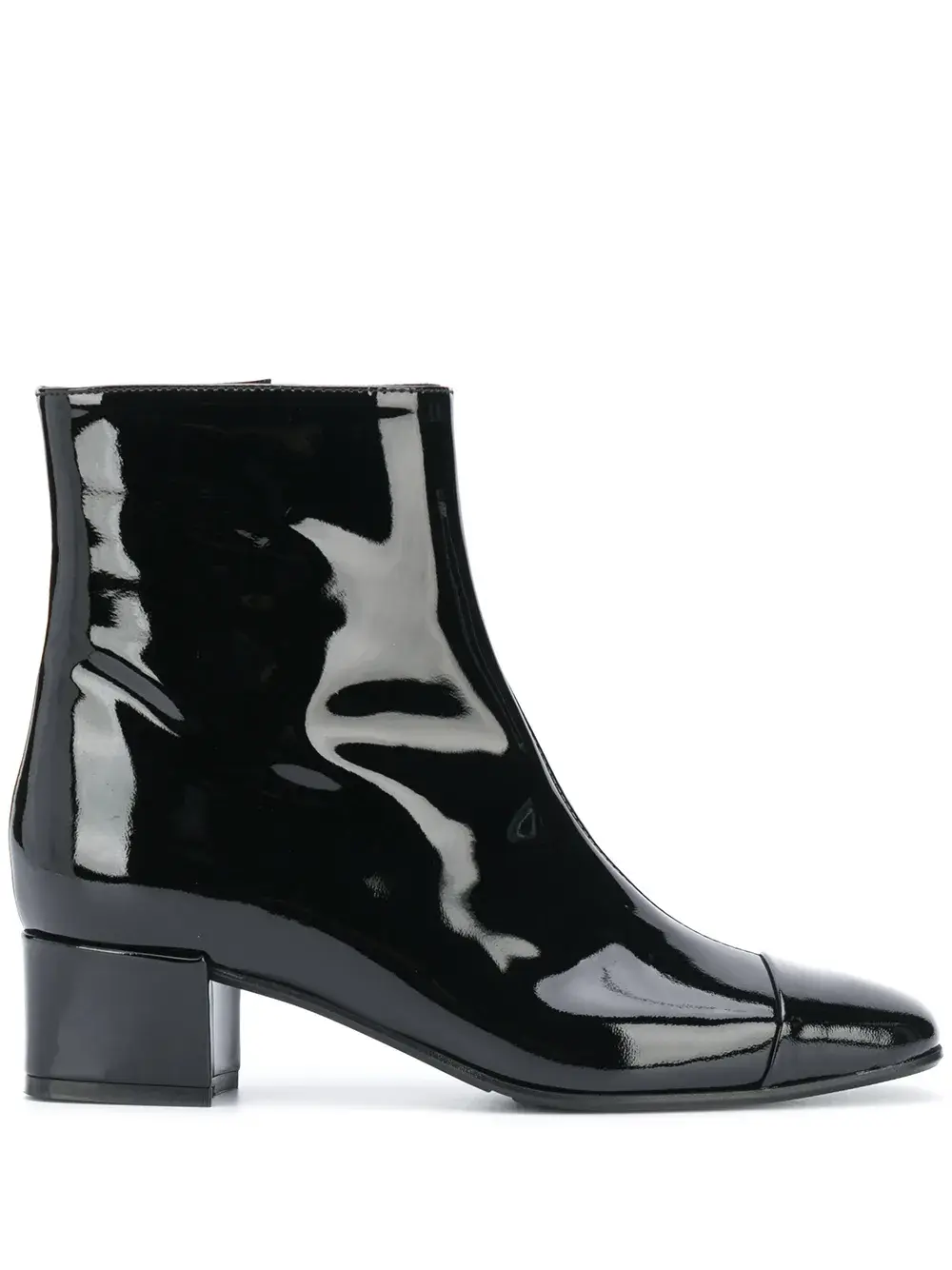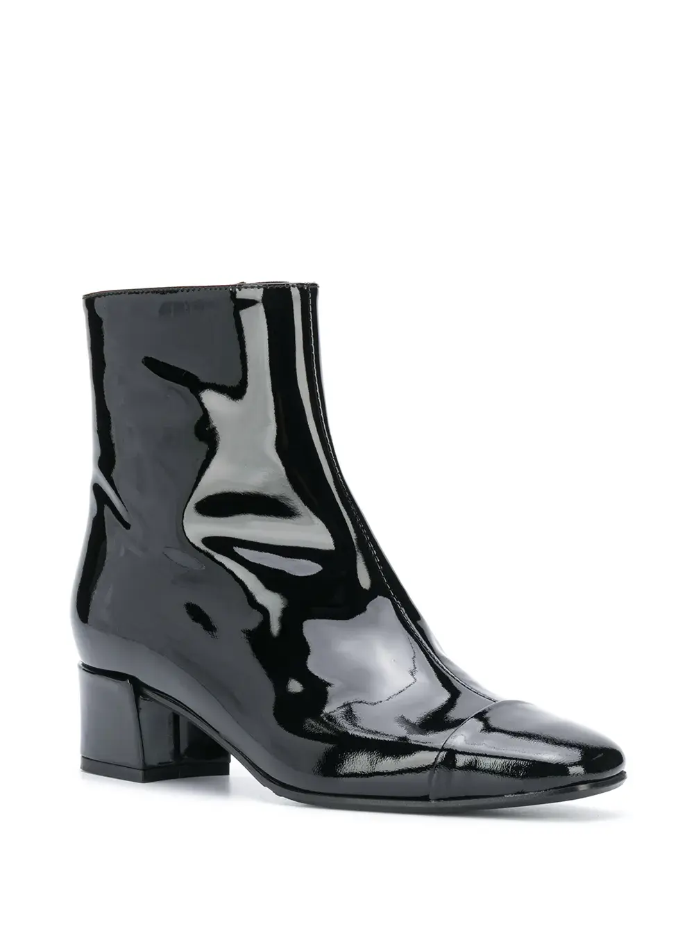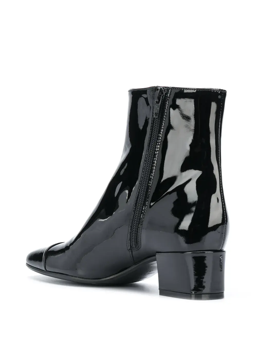 Застежки на молнии сбоку, квадратный носок, длина по щиколотку и каблук средней высоты.