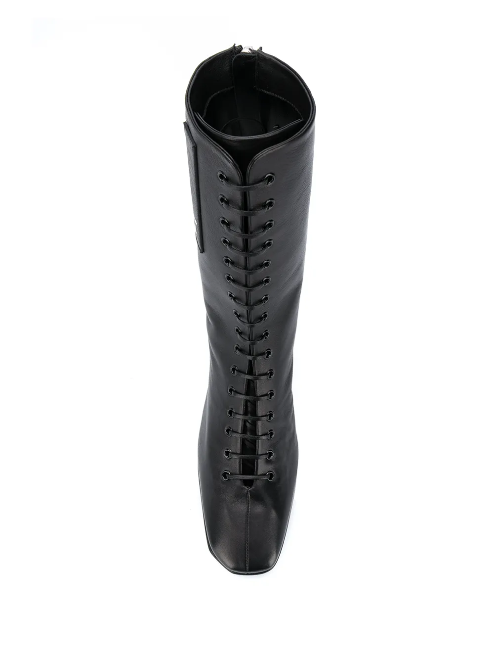 Квадратный носок, шнуровка спереди, тисненый логотип сбоку, маленький накладной карман, каблук-шпилька и сегментированная резиновая подошва. Цвет: черный.