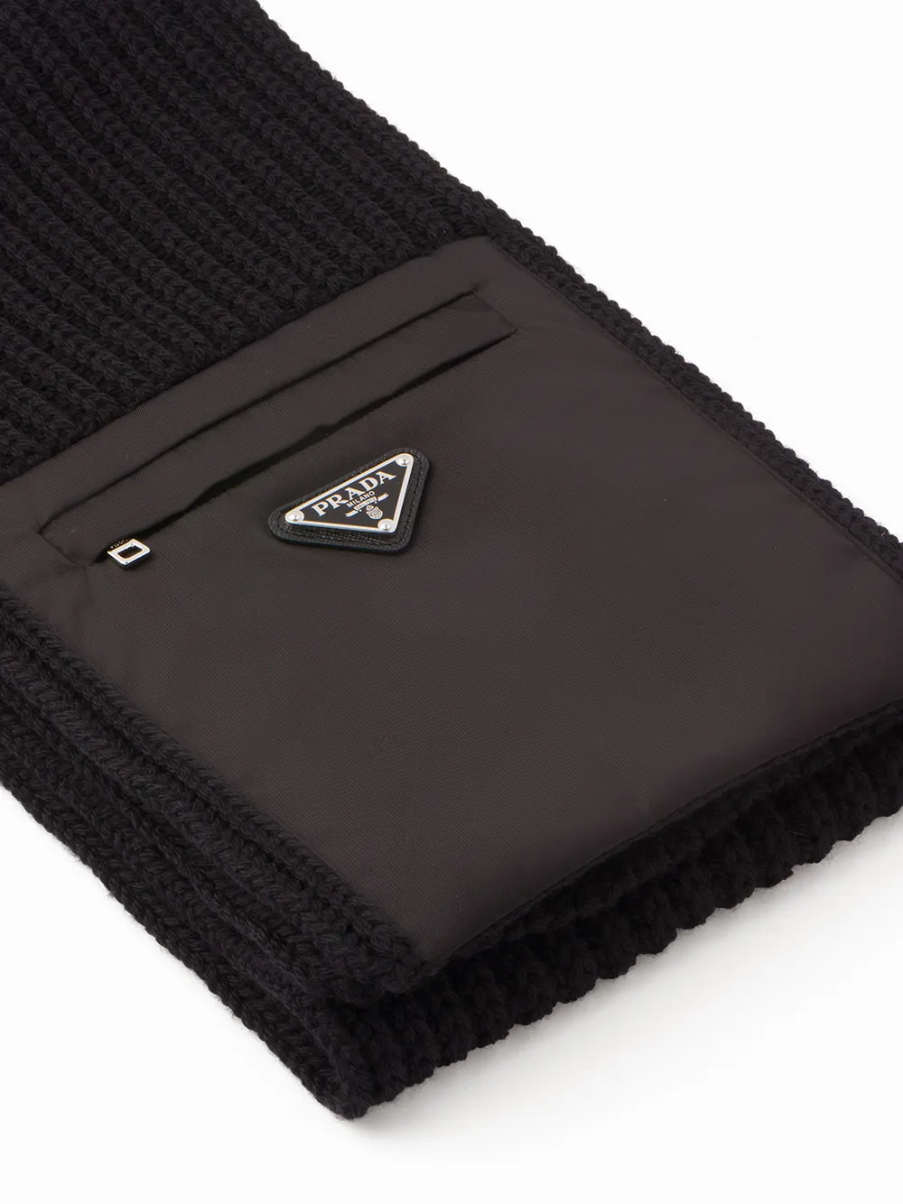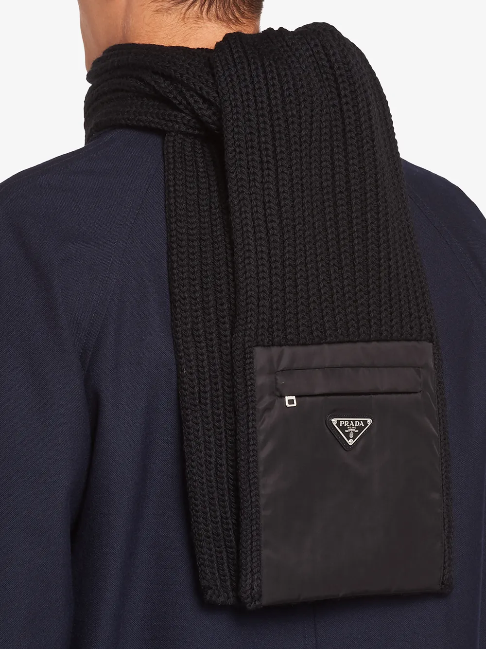 Вязаный шарф с карманом на молнии от Prada (Прада). Ребристая вязка и прямой подол. Цвет: черный.