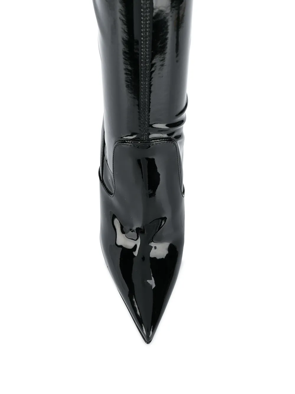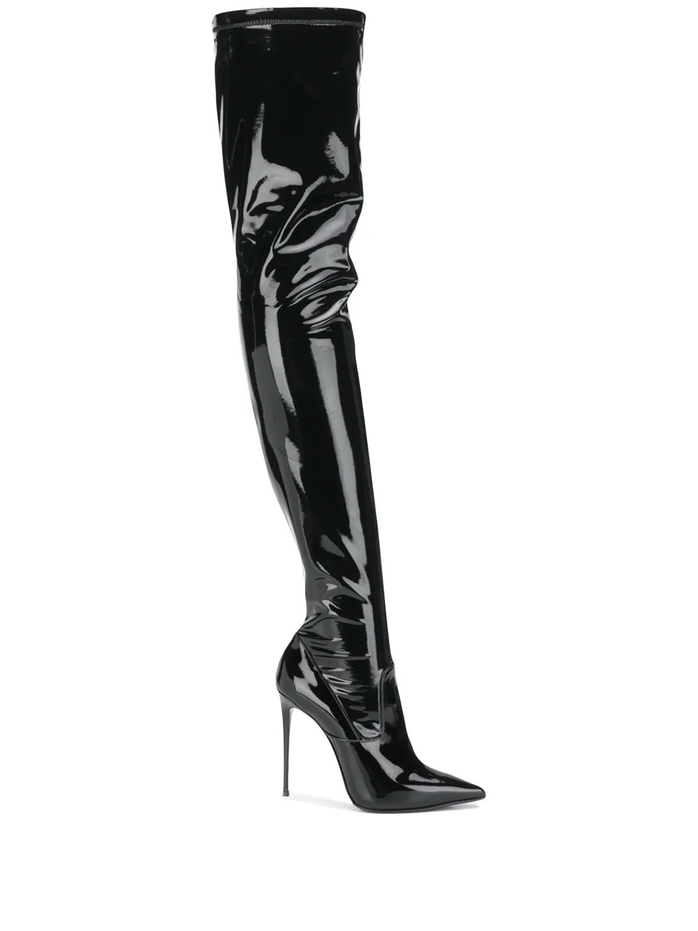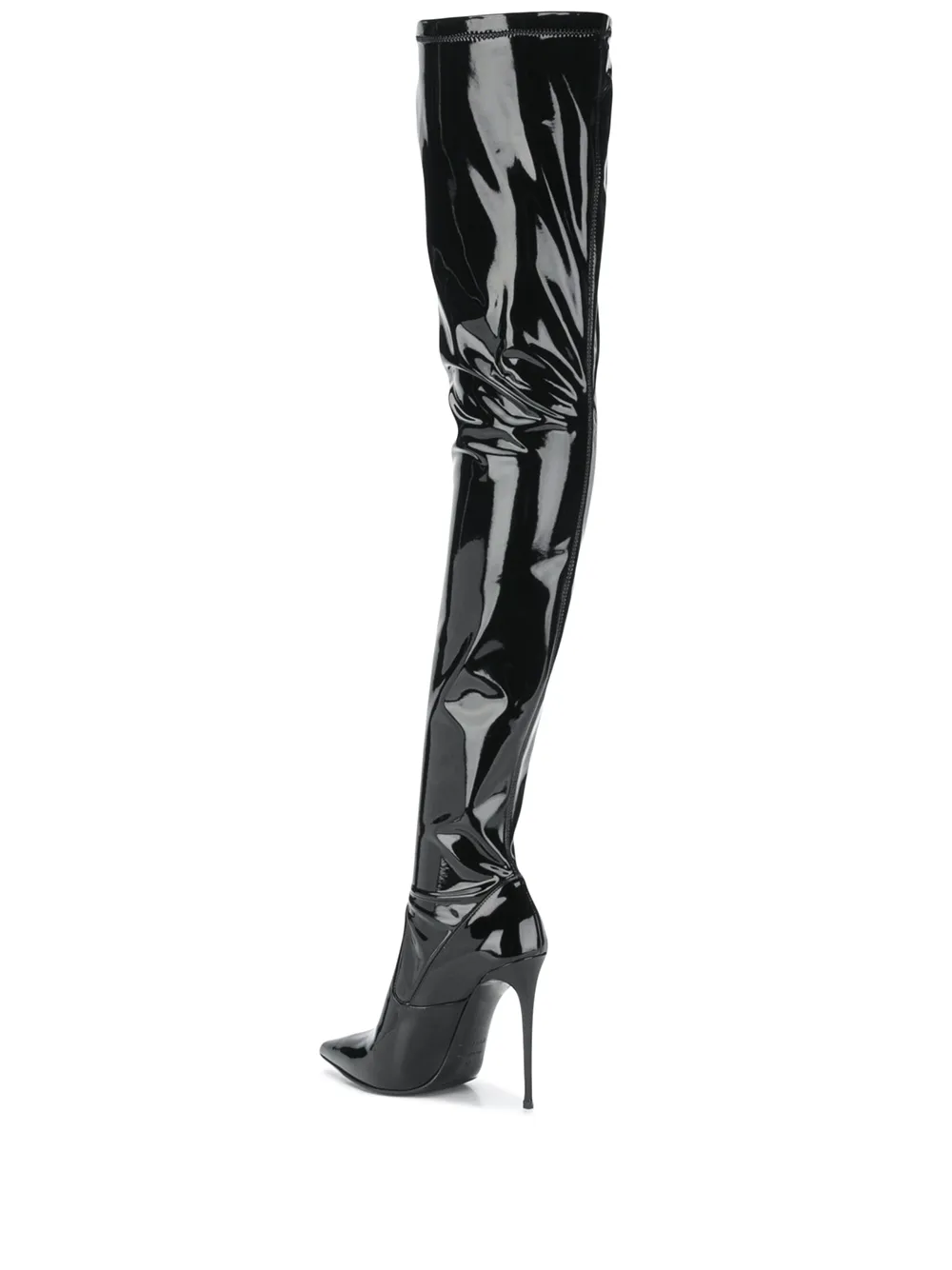 Глянцевая фактура, заостренный носок, без застежки и высокий каблук. Цвет: черный.