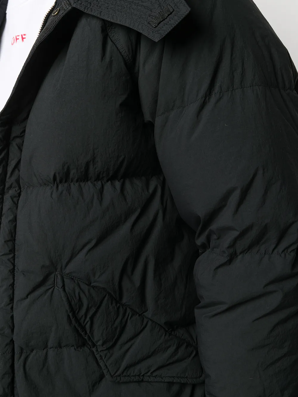 Дутый материал, классический капюшон, потайная застежка спереди, длинные рукава, два передних кармана с клапанами и прямой подол.