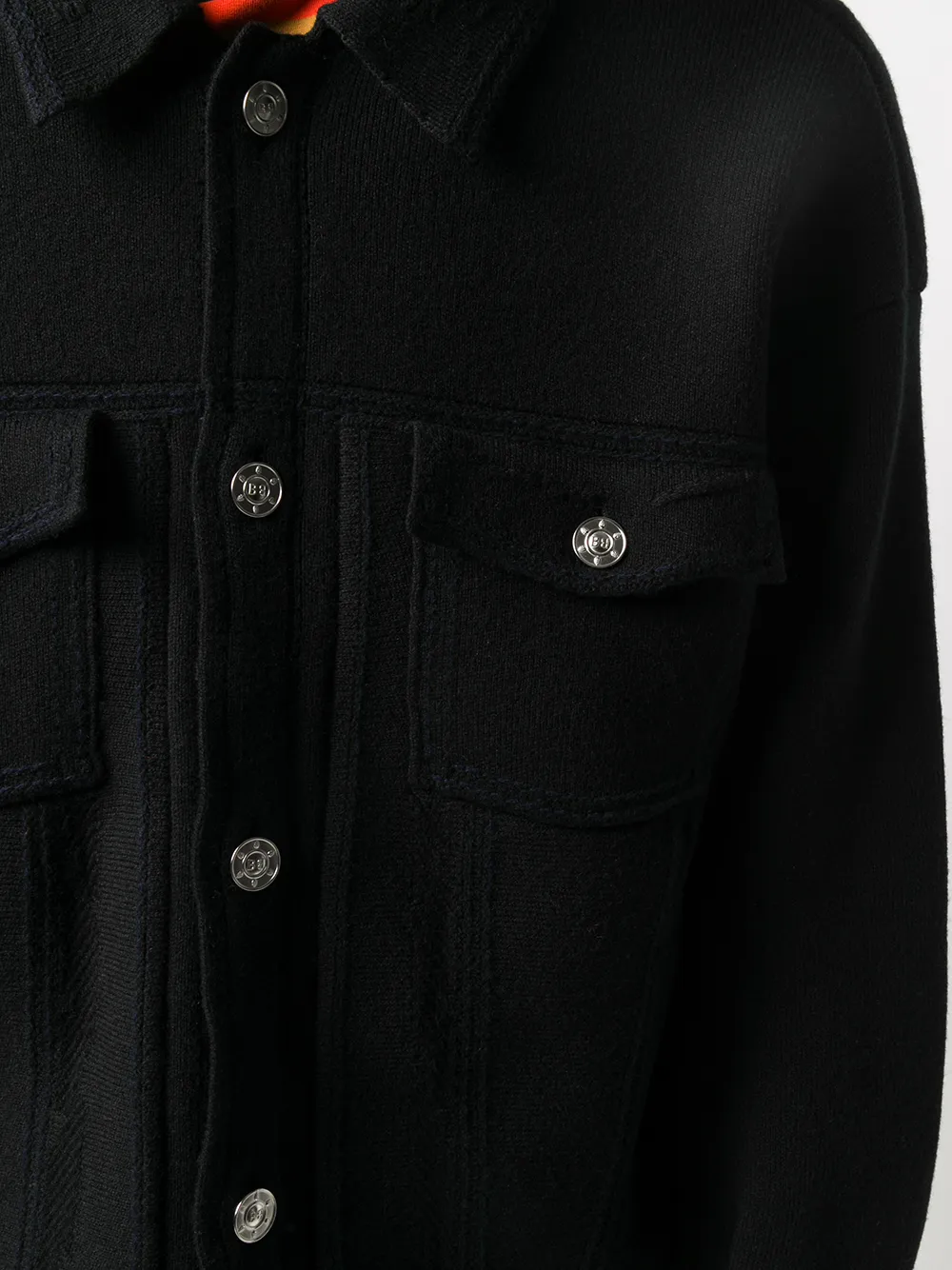 Классический воротник, застежка на пуговицах спереди, длинные рукава и два нагрудных кармана с клапанами. Цвет: черный.