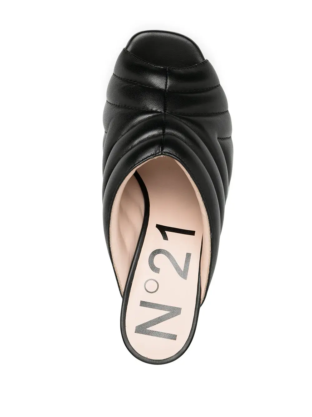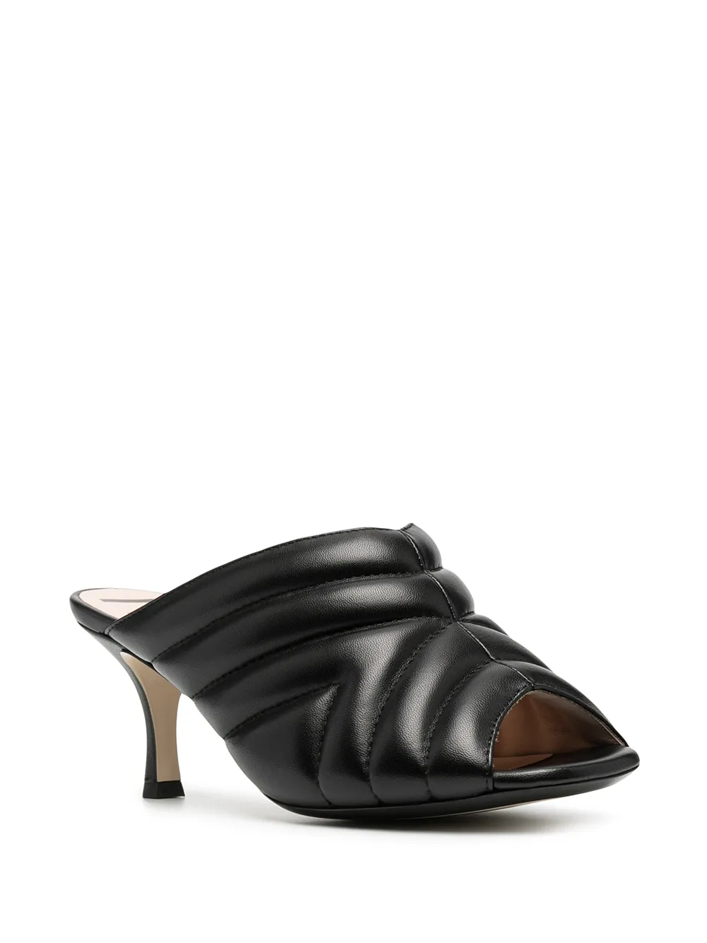 Cтеганая модель, открытый носок, без задника, стелька с логотипом и каблук средней высоты. Цвет: черный.