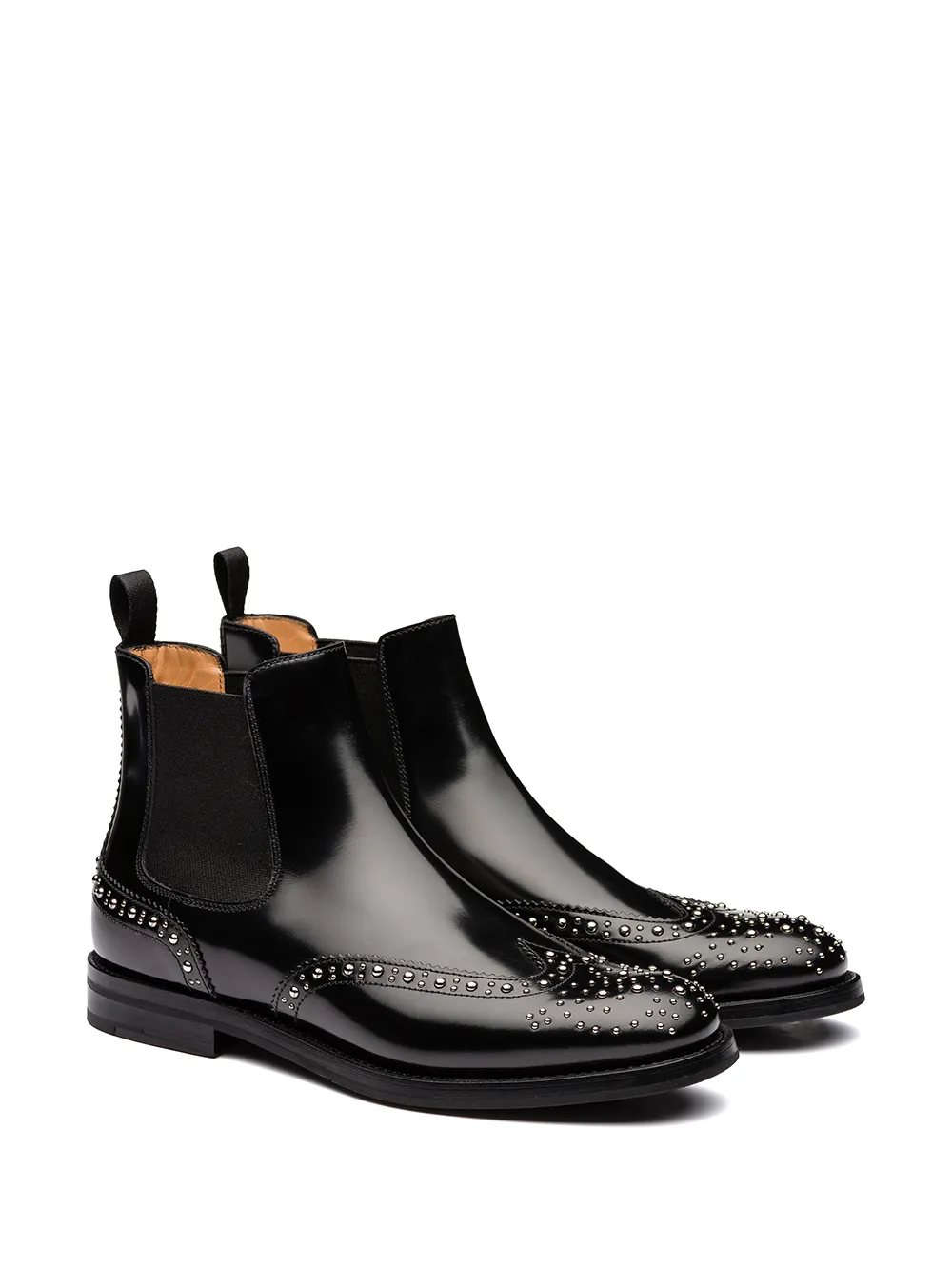 Глянцевый эффект, серебристые заклепки, закругленный носок, петля для подтягивания сзади, низкий блочный каблук и резиновая подошва. Цвет: черный.