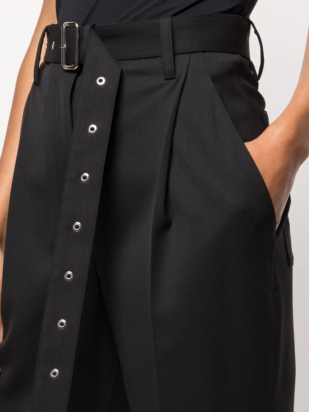 Ремень на талии, два прорезных кармана по бокам, плиссировка, укороченная длина и тональная строчка. Цвет: черный.