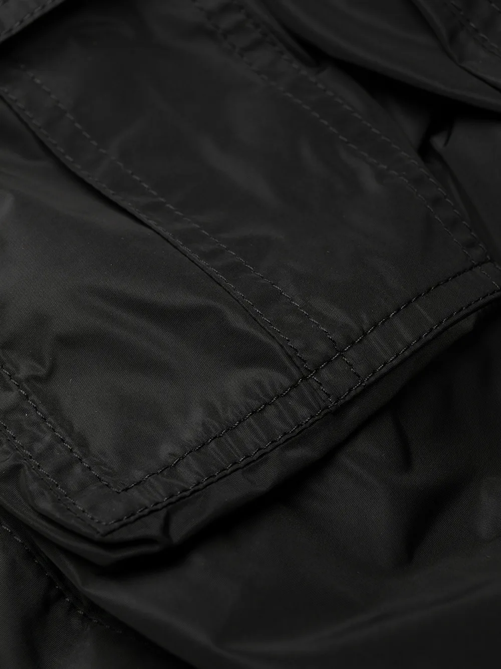 Серебристая фурнитура, затягивающийся на шнурок капюшон, застежка на молнии спереди, застежка на кнопках, два передних кармана с клапанами, два кармана на молнии по бокам и длинные рукава. Цвет: черный.