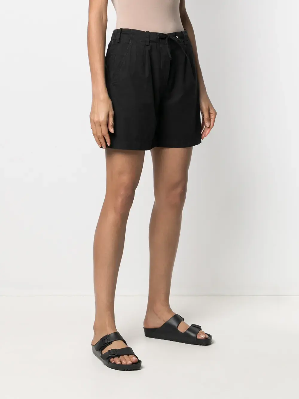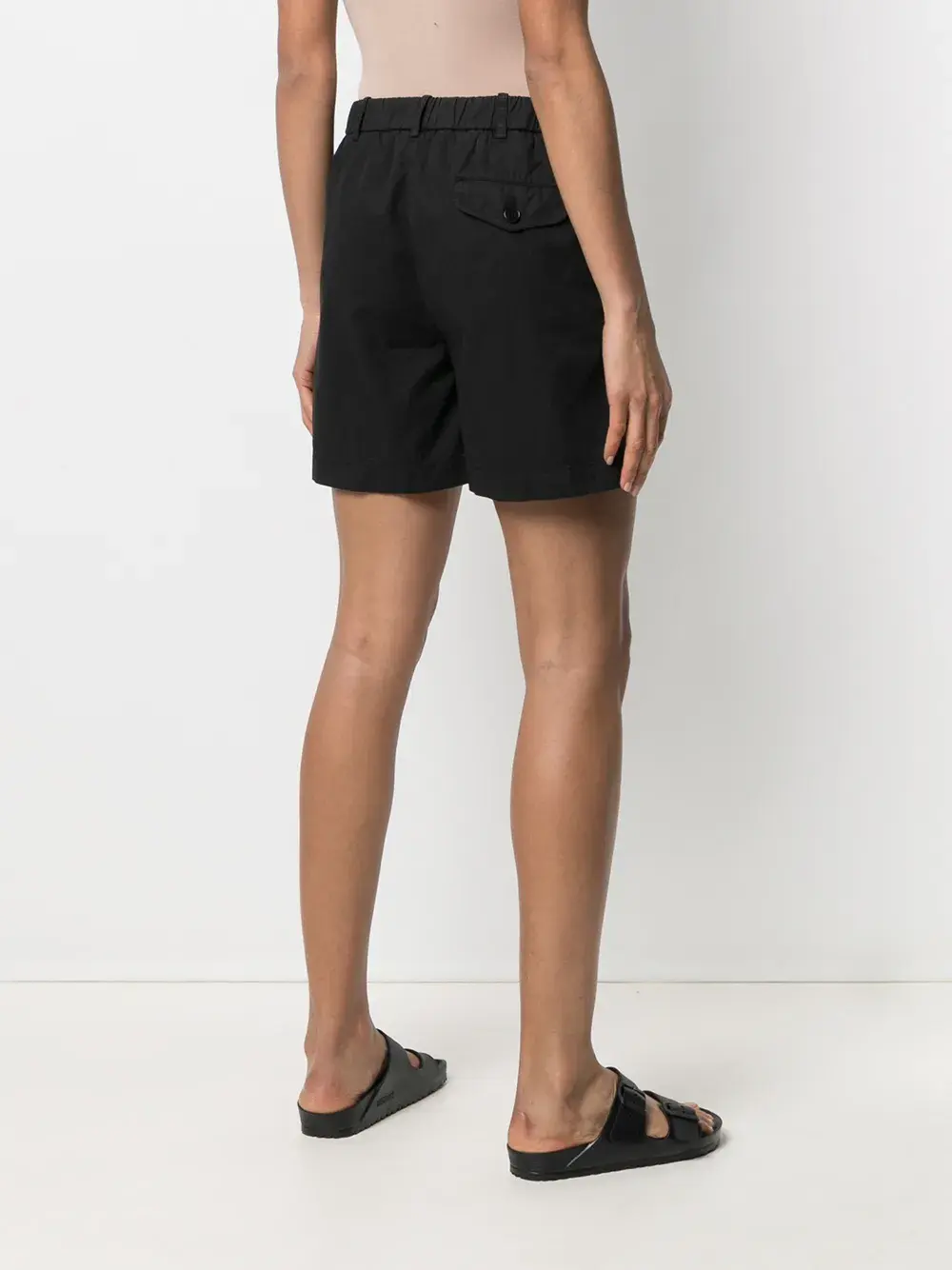 Завышенная талия, ширинка на пуговицах, застежка на шнурке, петли для ремня, два прорезных кармана по бокам и карман с клапаном сзади. Цвет: черный.