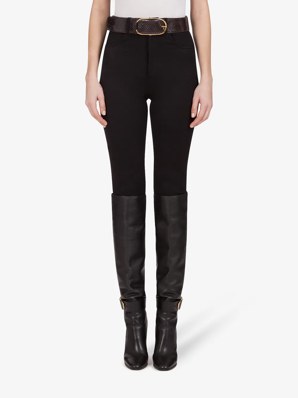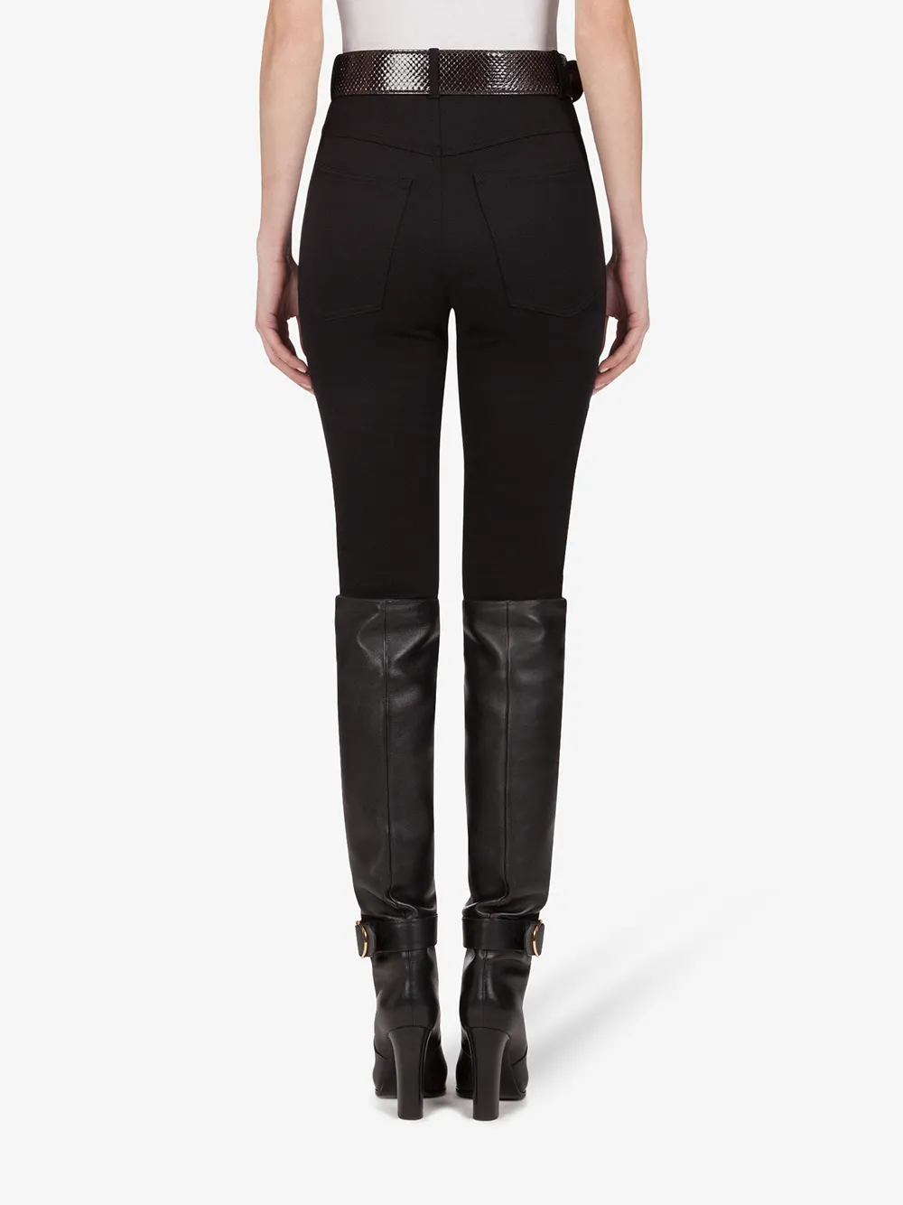 Завышенная талия, петли для ремня, два кармана по бокам, два накладных кармана сзади, эластичная модель и облегающий крой. Цвет: черный.
