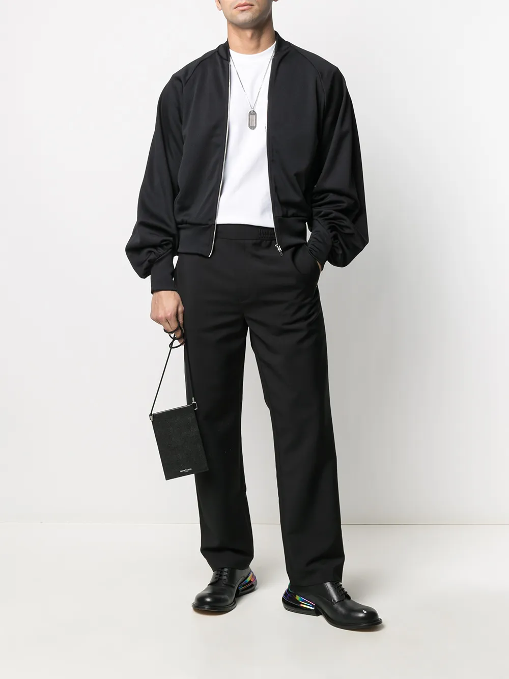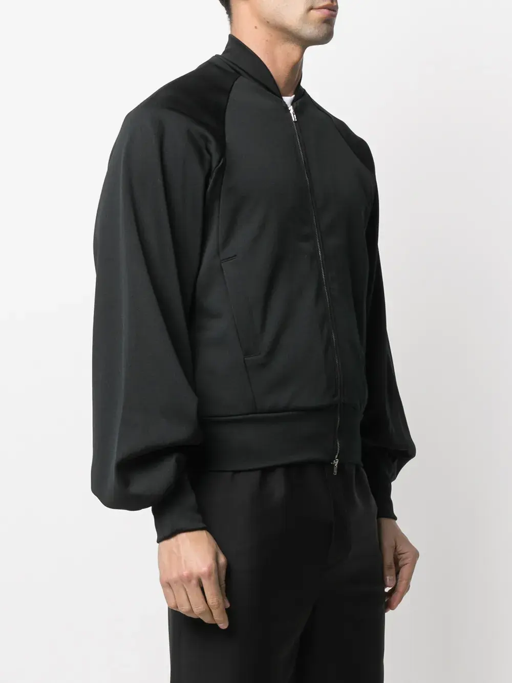 Воротник-стойка в рубчик, застежка на молнии спереди, длинные рукава реглан, манжеты в рубчик, два прорезных кармана по бокам и подол в рубчик. Цвет: черный.