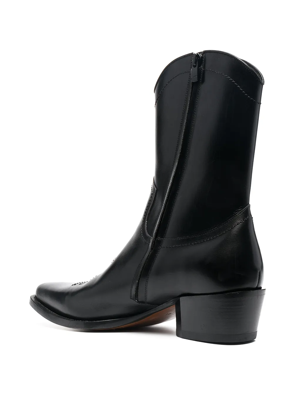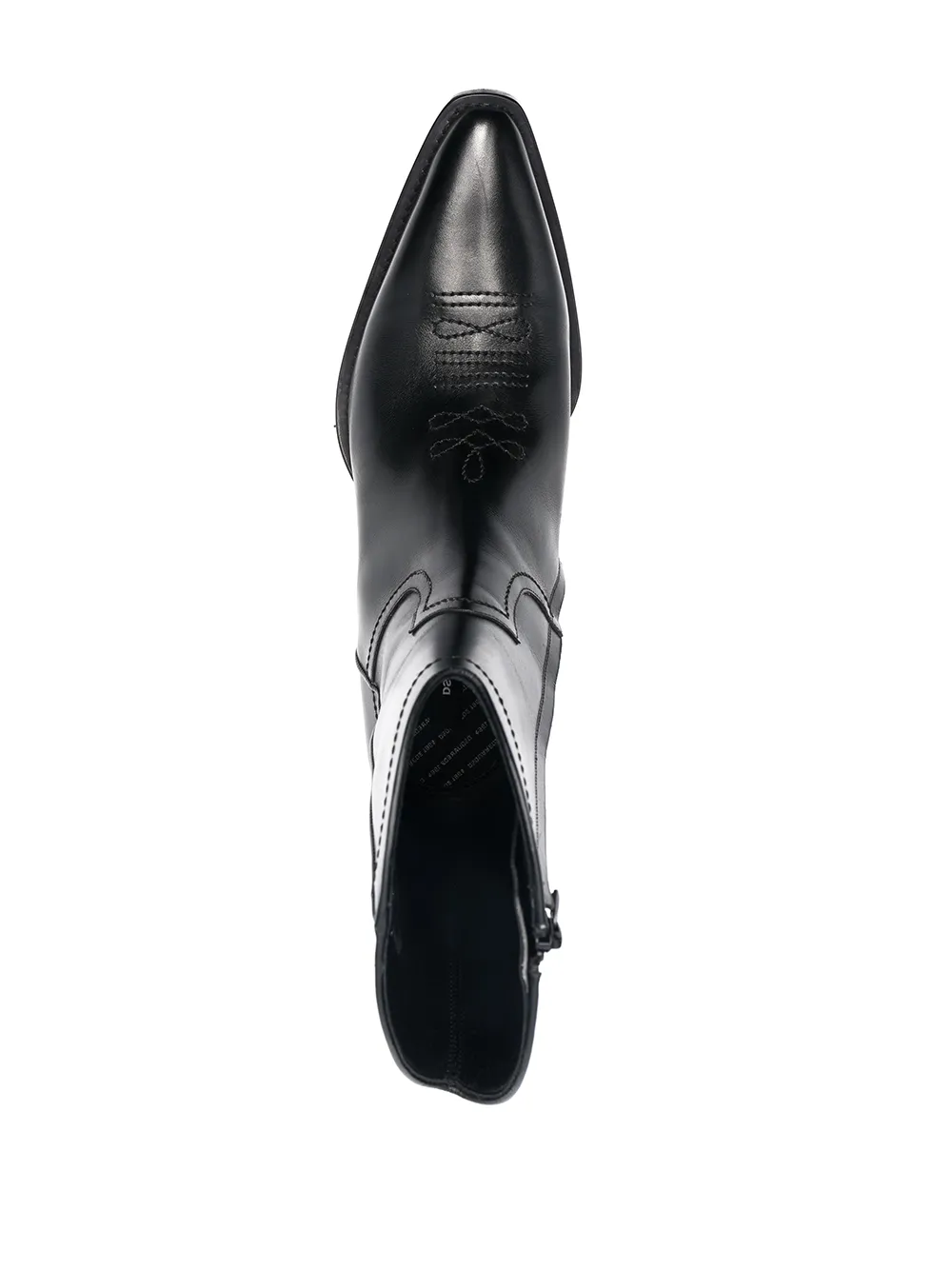 Заостренный носок, тональная строчка, застежка на молнии сбоку, стелька с логотипом и низкий блочный каблук. Цвет: черный.