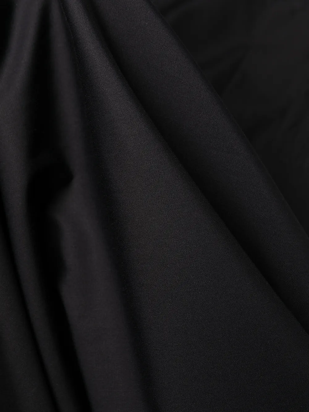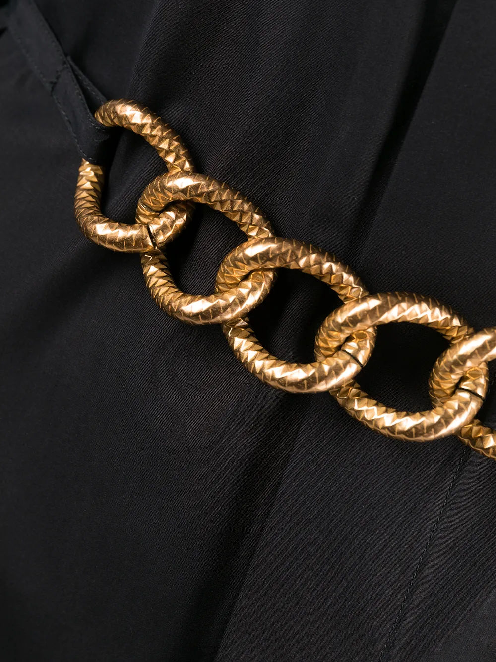 Цепочка, золотистая фурнитура, воротник-стойка, застежка на пуговицах спереди, длинные рукава, нагрудный накладной карман, два прорезных кармана по бокам и длина миди. Цвет: черный.