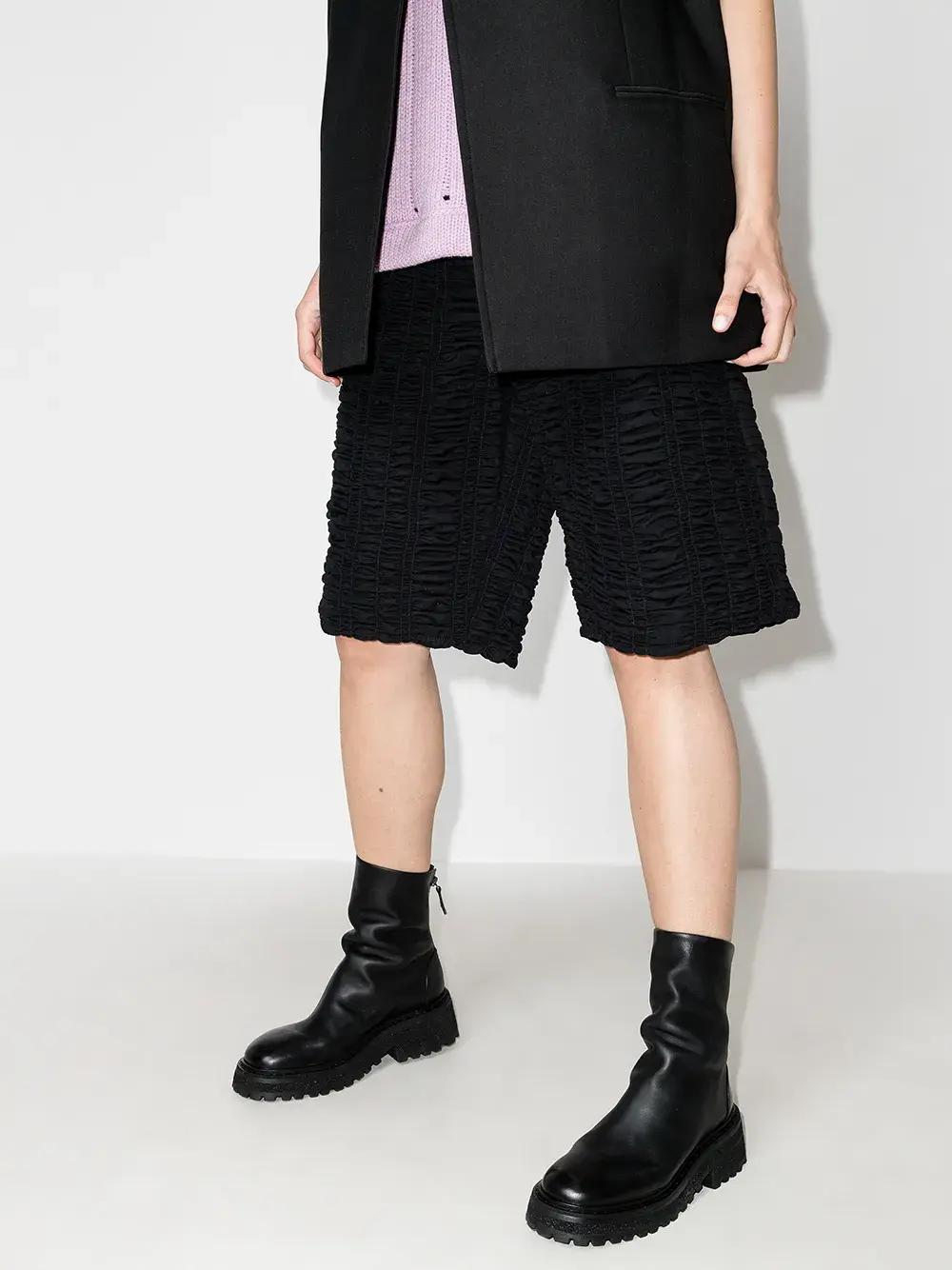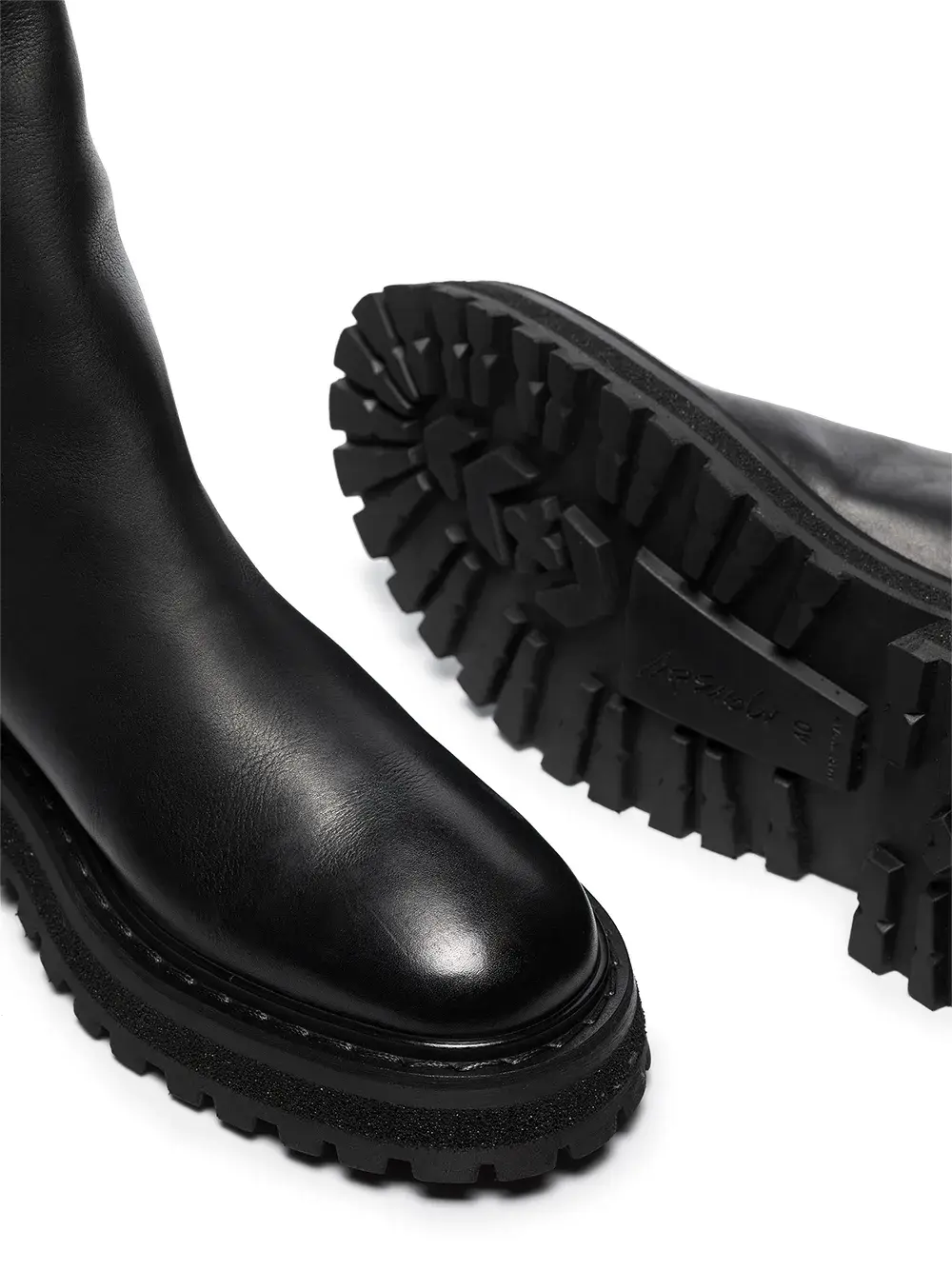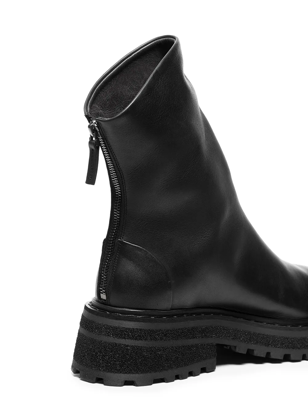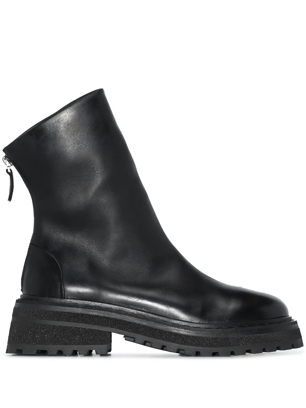 Застежка на молнии сзади, закругленный носок, ребристая резиновая подошва и кожаная подкладка. Цвет: черный.