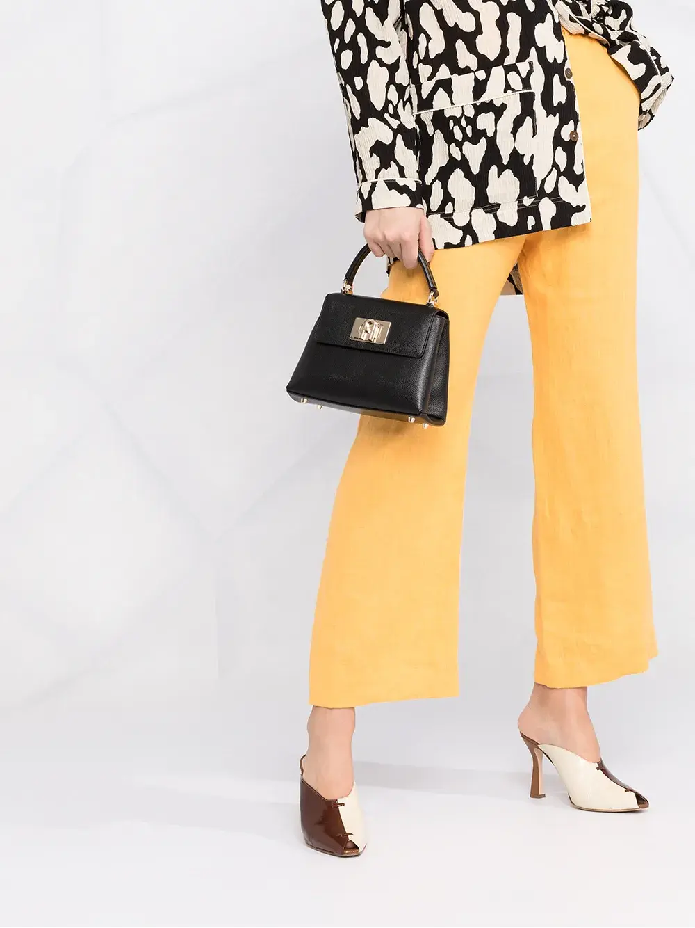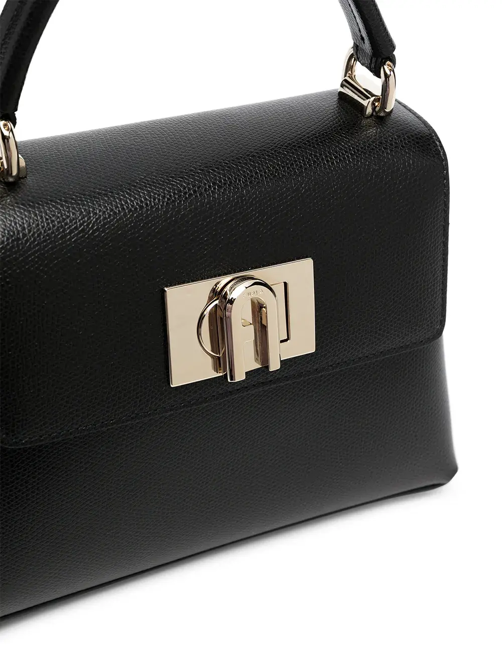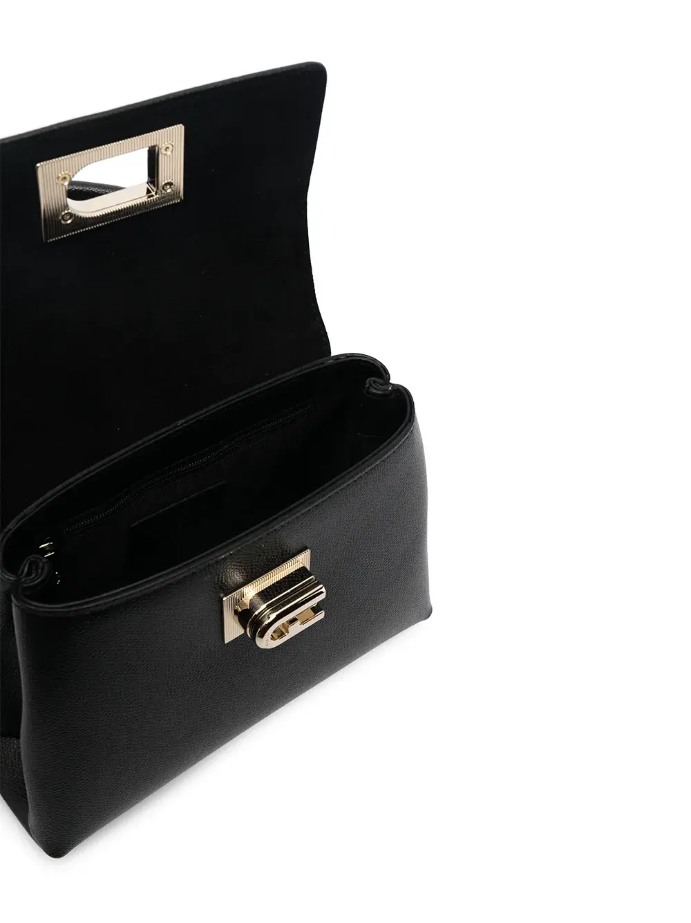 Закругленная верхняя ручка, съемный регулируемый ремень на плечо, золотистая фурнитура, выгравированный логотип, застежка с поворачивающимся замком, накладной карман сзади, застежка с клапаном спереди, основное отделение, цельная подкладка, внутренний карман на молнии, внутренняя вставка с логотипом и металлические ножки. Цвет: черный.