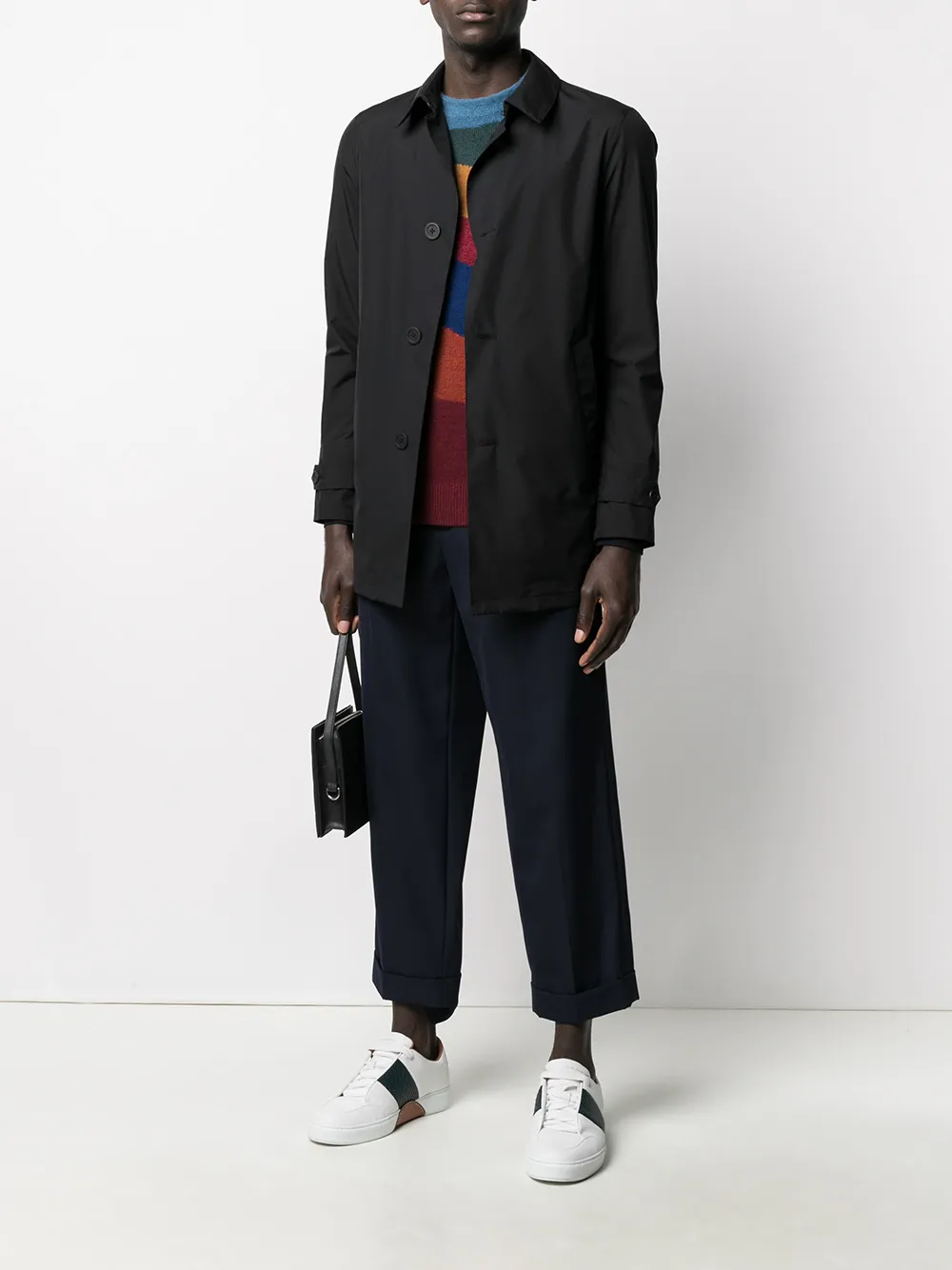 Классический воротник, застежка на пуговицах спереди, длинные рукава, два прорезных кармана по бокам, манжеты с ремешками и шлица по центру сзади. Цвет: черный.