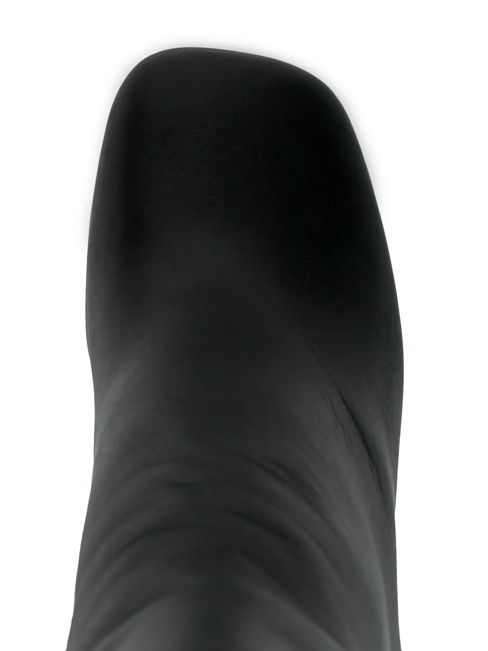 Длина до середины голени, высокий блочный каблук, застежка на молнии сзади и миндалевидный носок. Цвет: черный.
