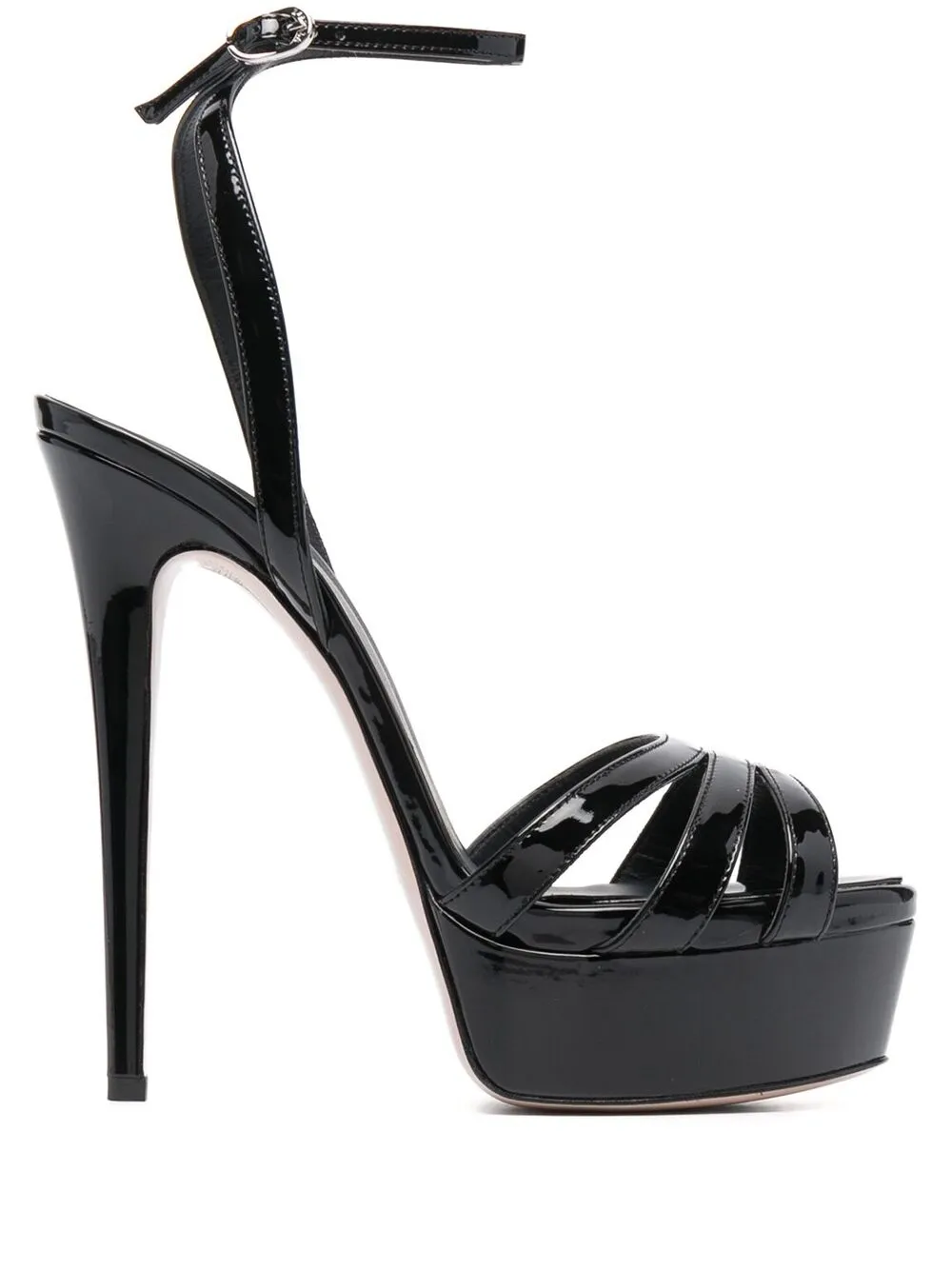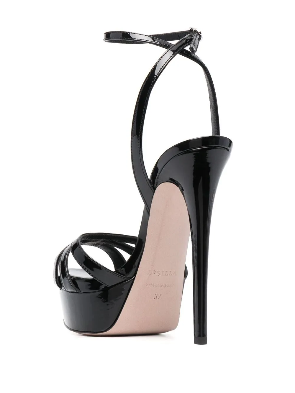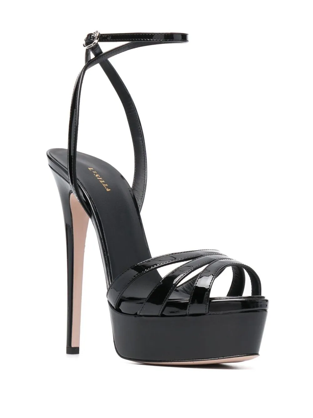 Несколько вариантов крепления ремня, открытый носок, высокий каблук и ремешок на щиколотке с пряжкой. Цвет: черный.
