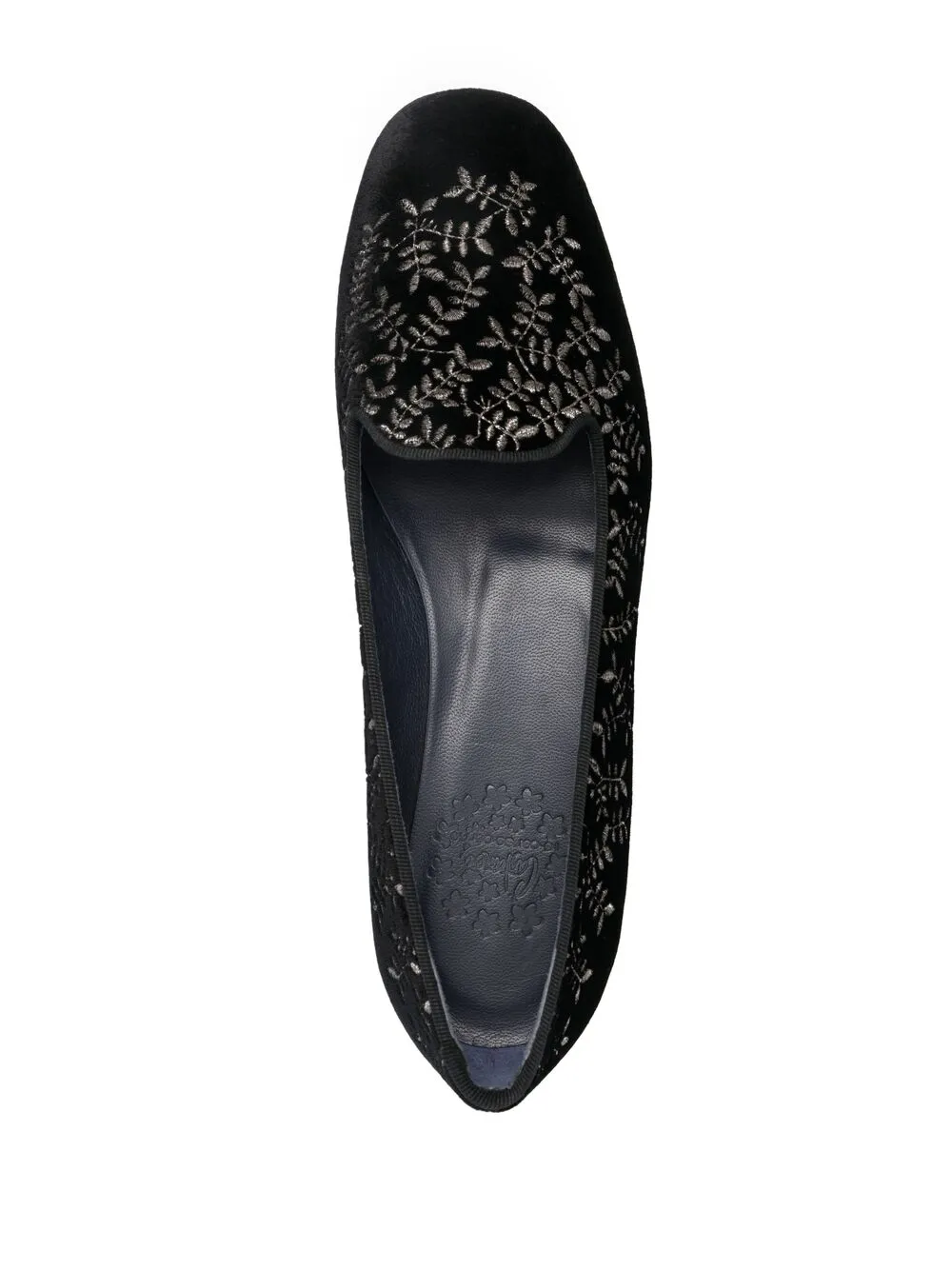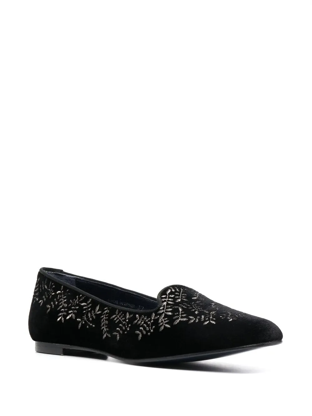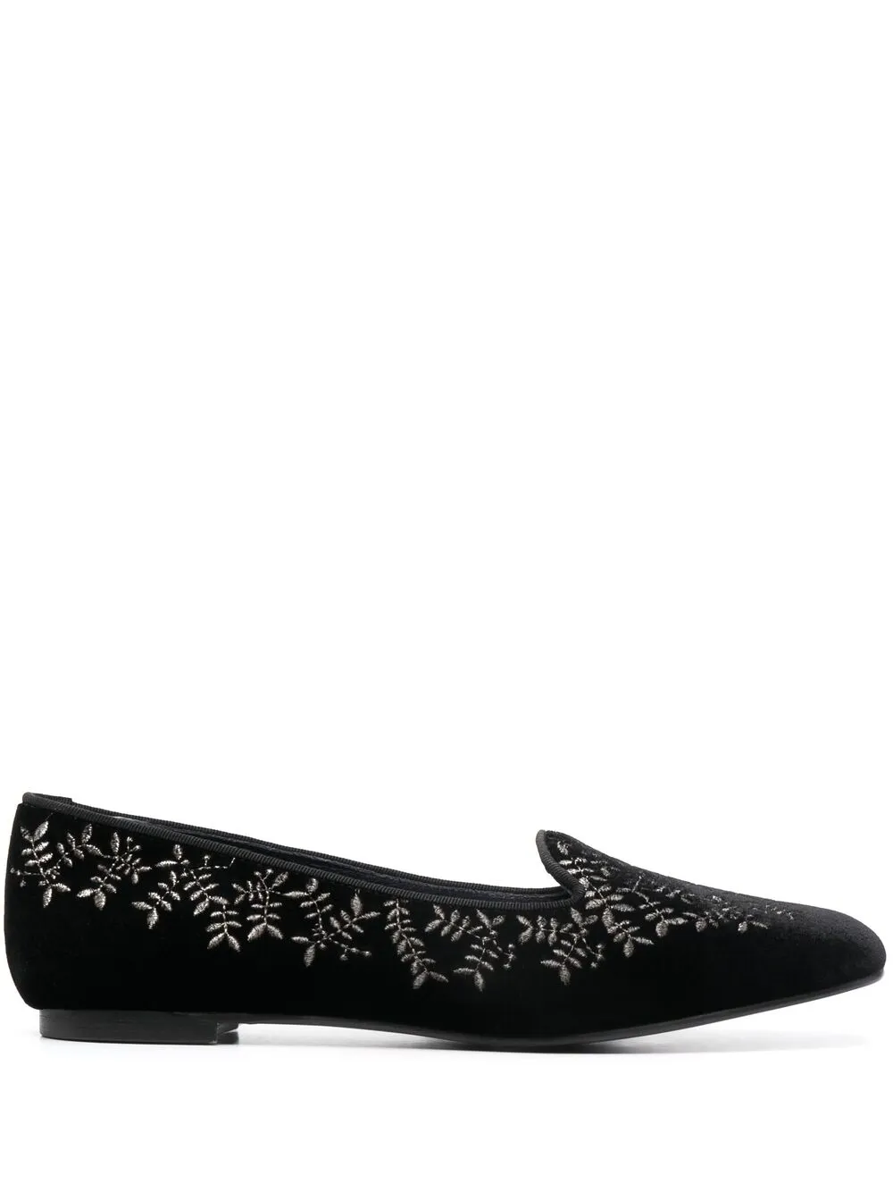 Вышивка, закругленный носок, модель без застежки, стелька с логотипом и плоская подошва.
