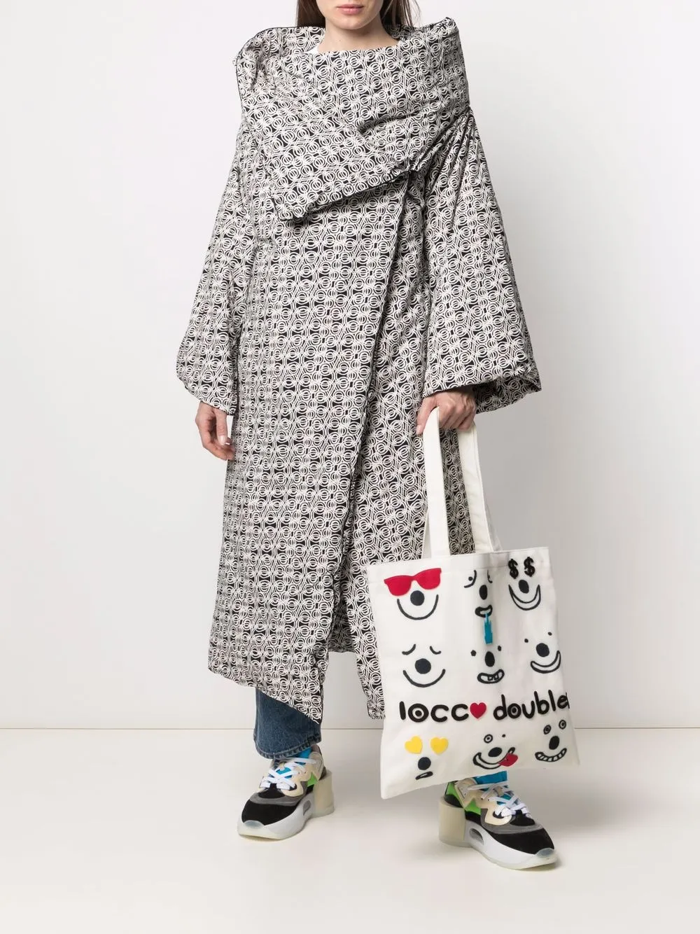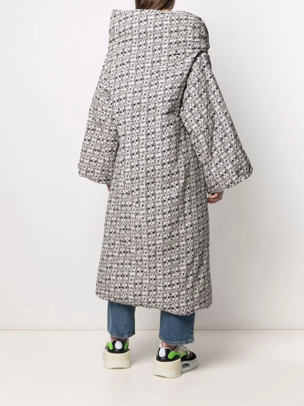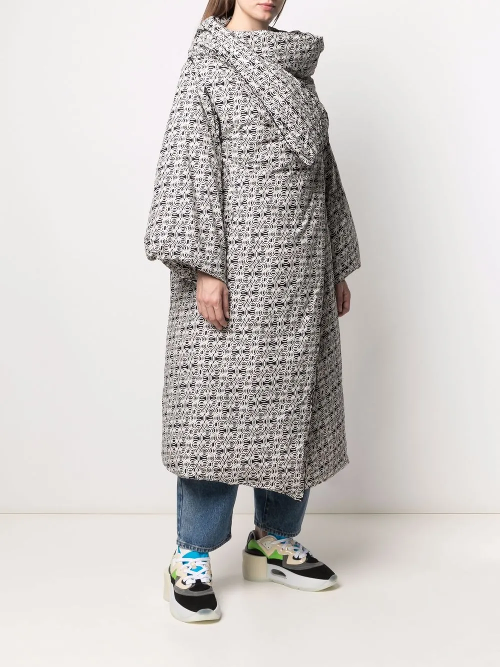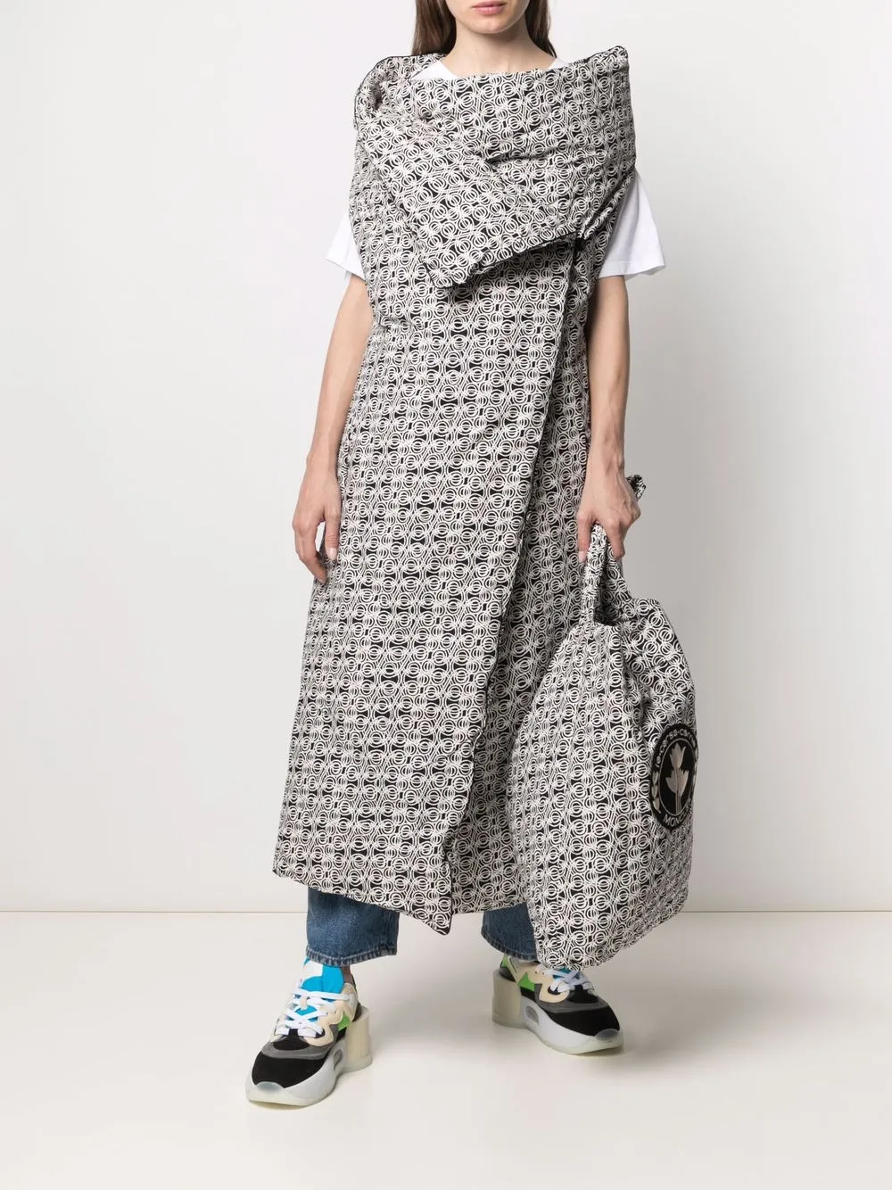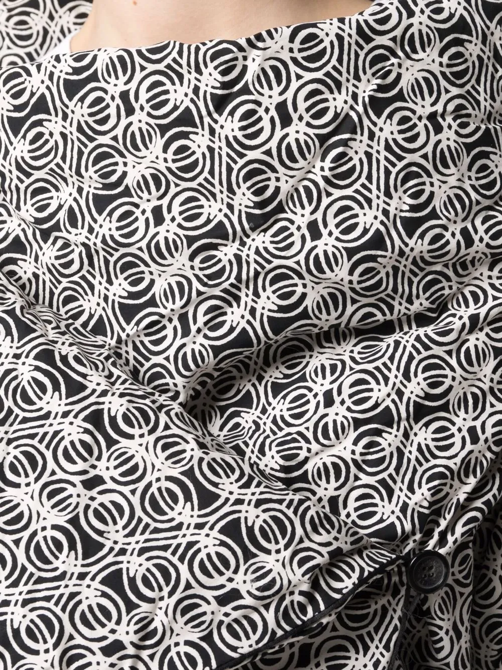 Геометричный принт, асимметричный вырез, потайная застежка спереди, съемные рукава, длинные широкие рукава и длинная модель.