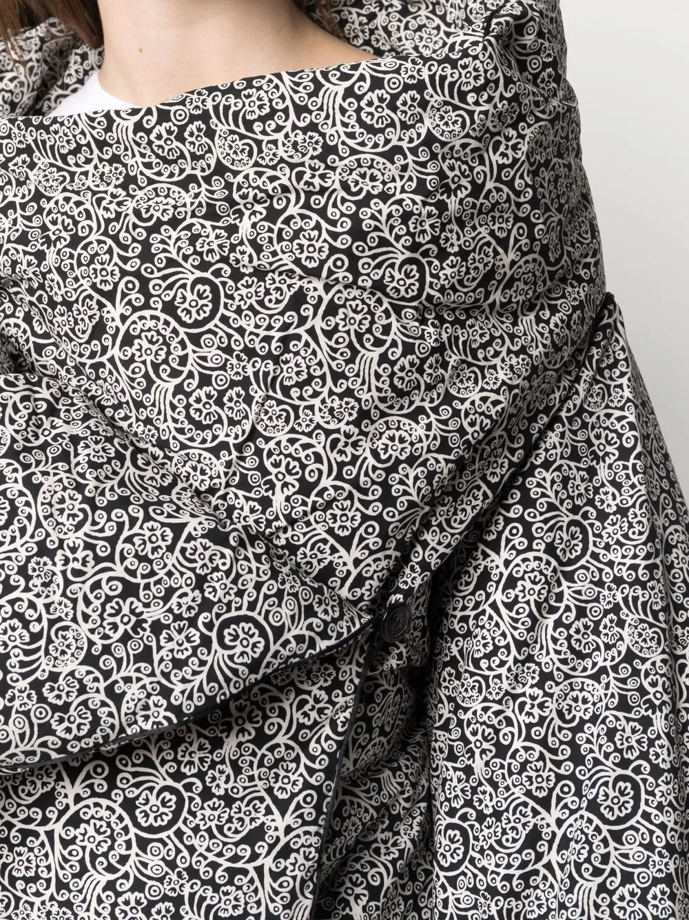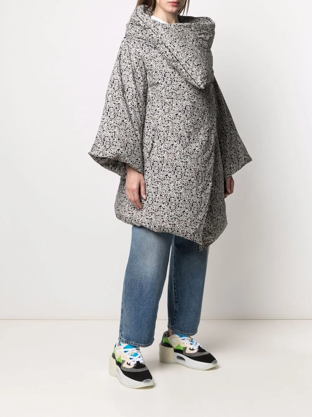 Сплошной цветочный принт, асимметричный вырез, потайная застежка спереди, съемные рукава, длинные широкие рукава, асимметричный подол и длина миди.