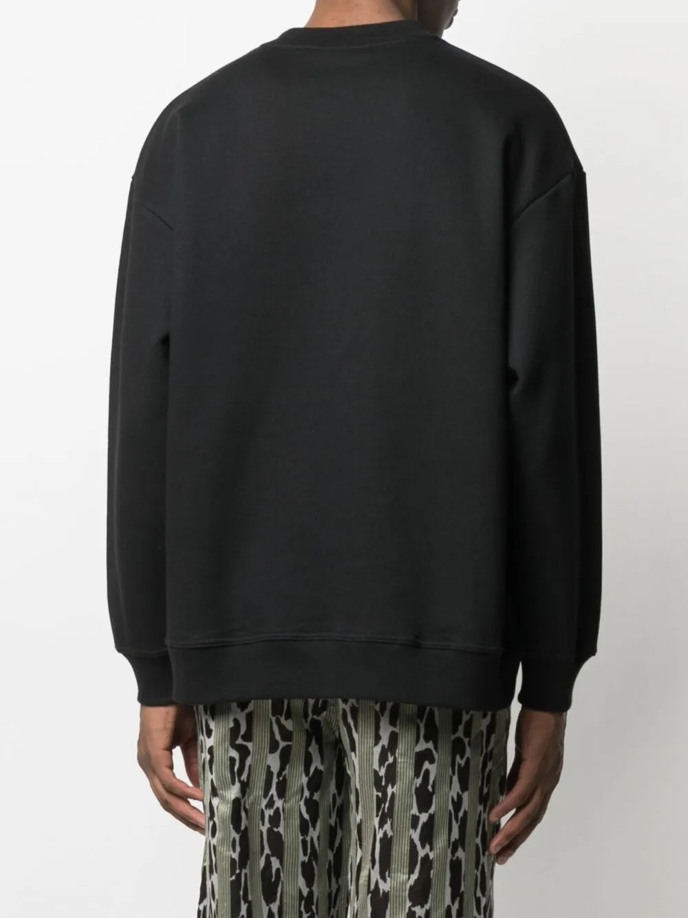 Вышитый логотип спереди, круглый вырез, приспущенные плечи, длинные рукава и прямой подол.