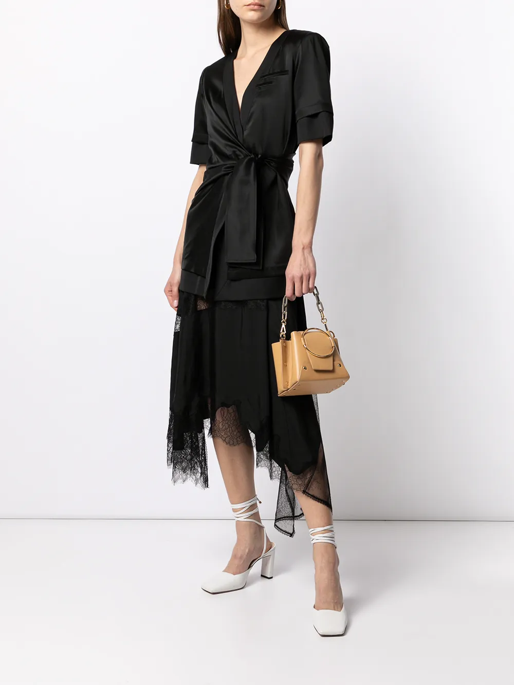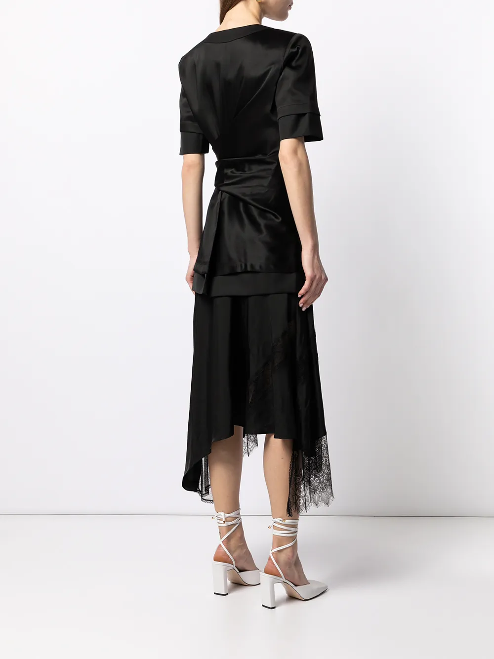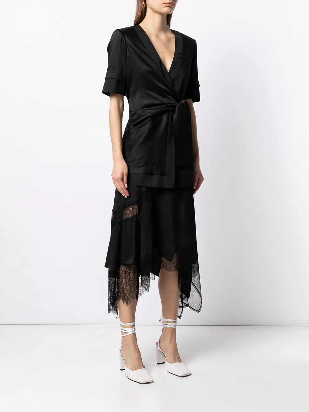 Короткие рукава, юбка с запахом, кулиска на талии и V-образный вырез. Цвет: черный.