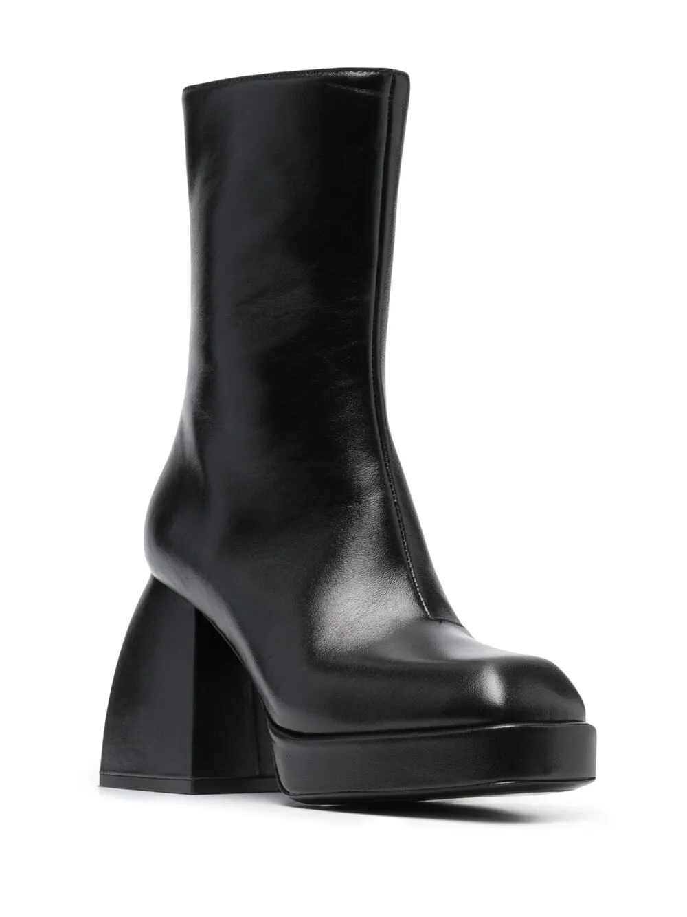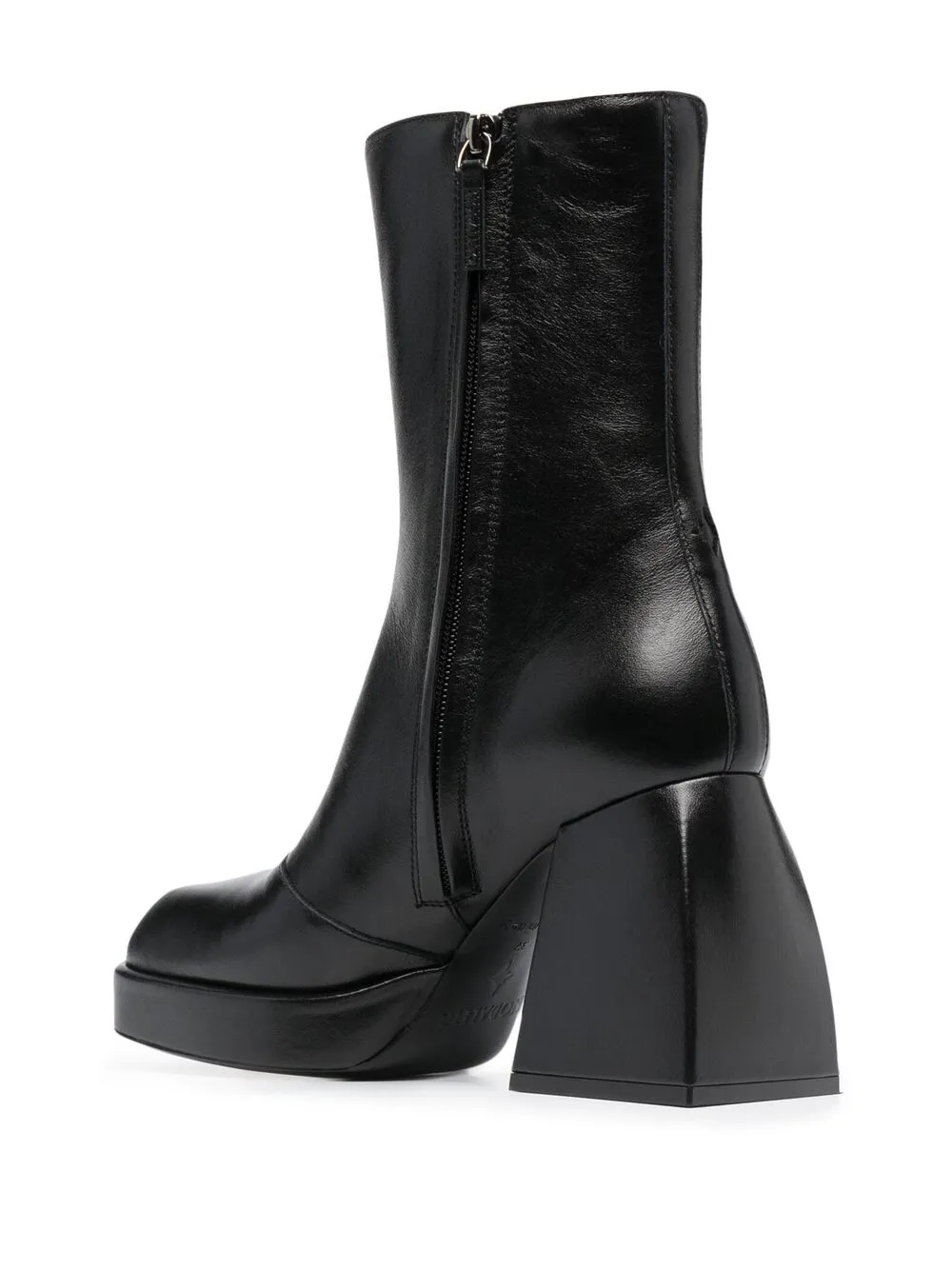 Квадратный носок, застежки на молнии сбоку, стелька с логотипом, подошва на платформе и высокий блочный каблук. Цвет: черный.