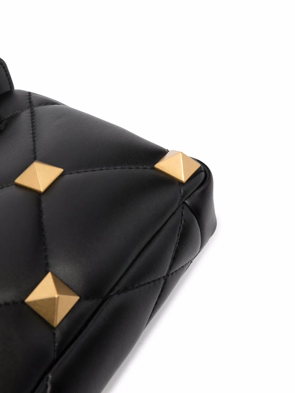 Золотистые заклепки Rockstud, стеганый материал, тональная строчка, ручка с плоским верхом, застежка на молнии сверху, внутренний прорезной карман, тисненый логотип внутри и регулируемый ремень на плечо. Цвет: черный.