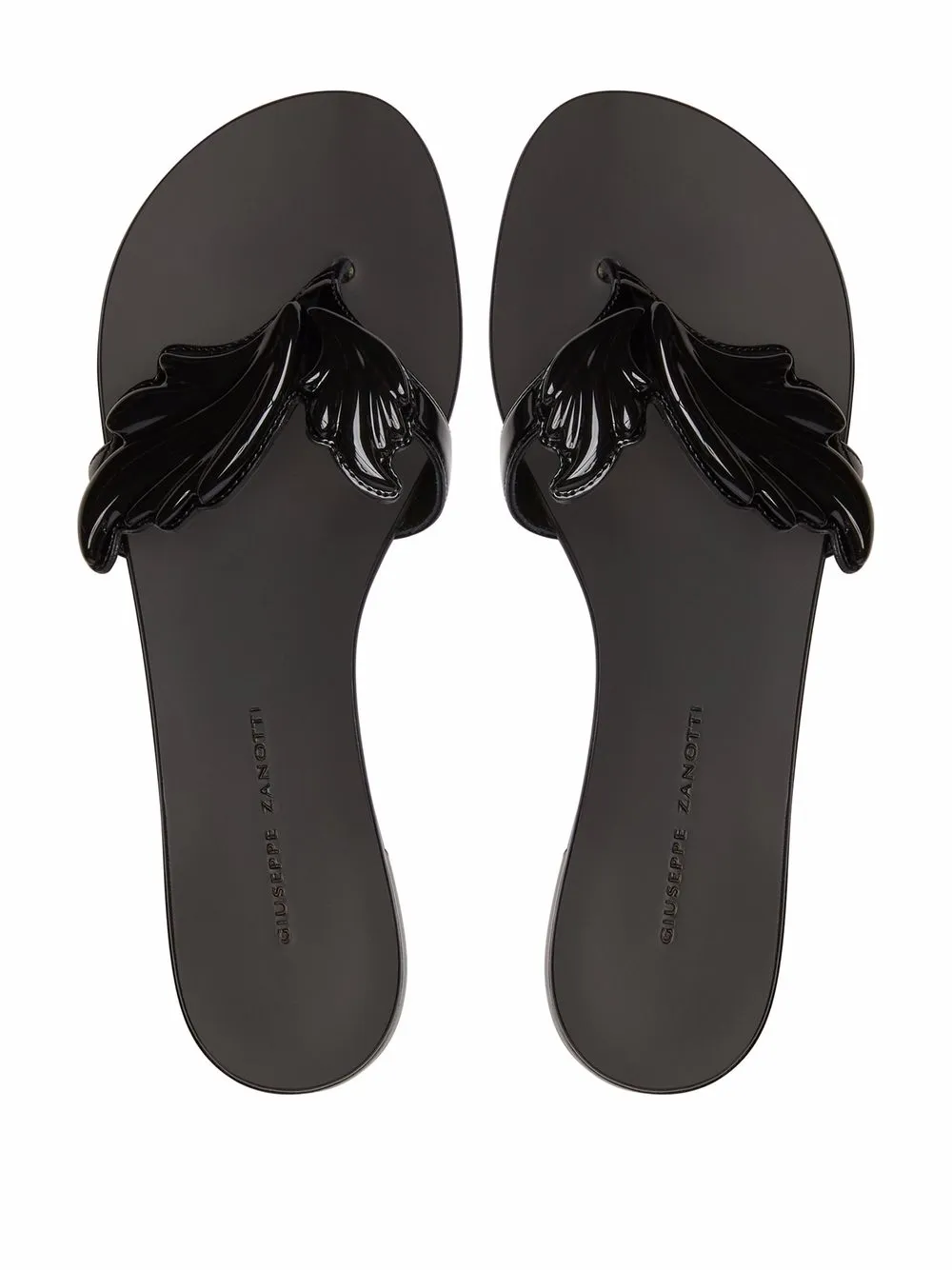 Кожаная стелька с логотипом, Т-образный ремешок, открытая спина, модель без застежки и плоская кожаная подошва. Цвет: черный.
