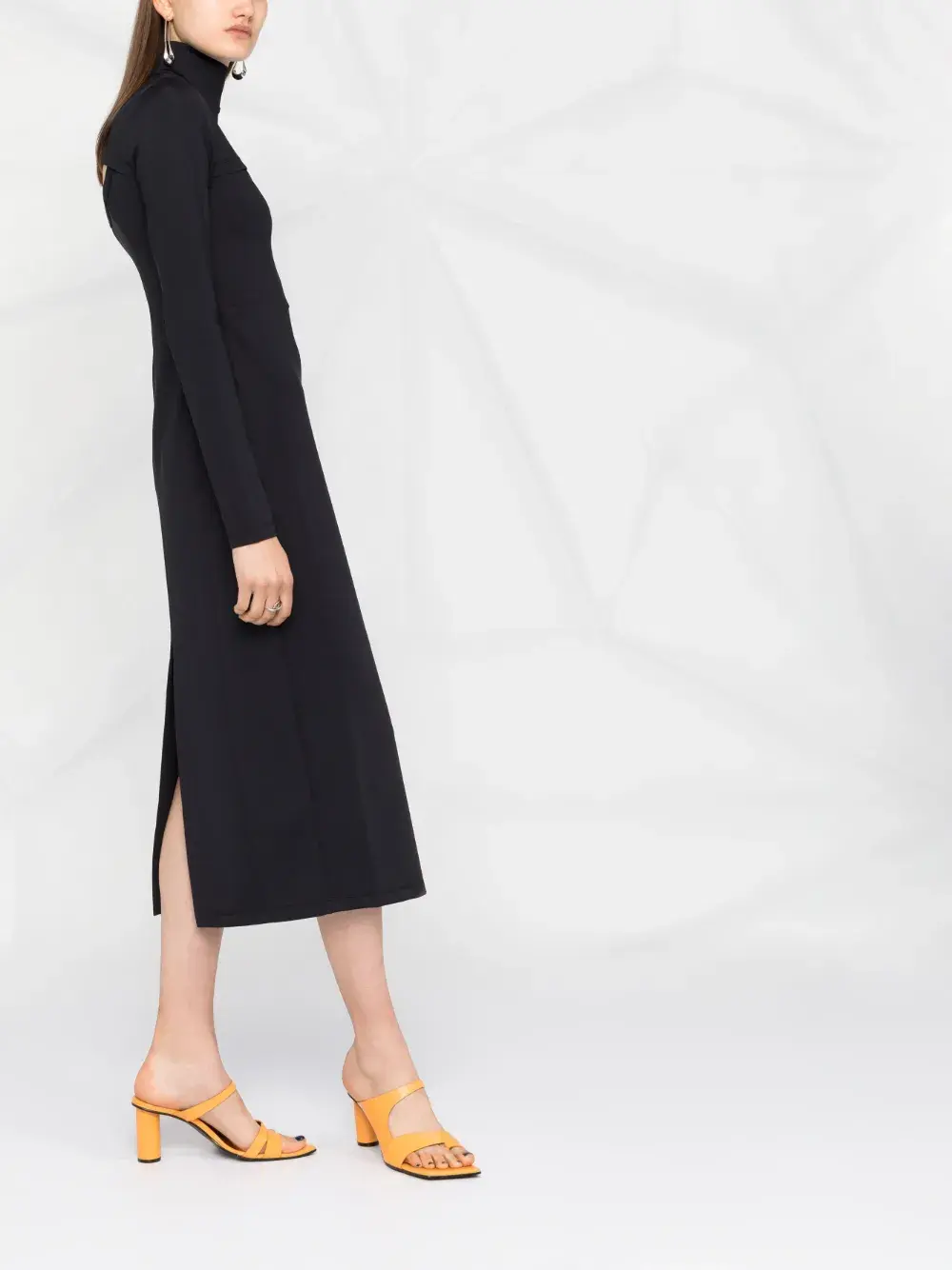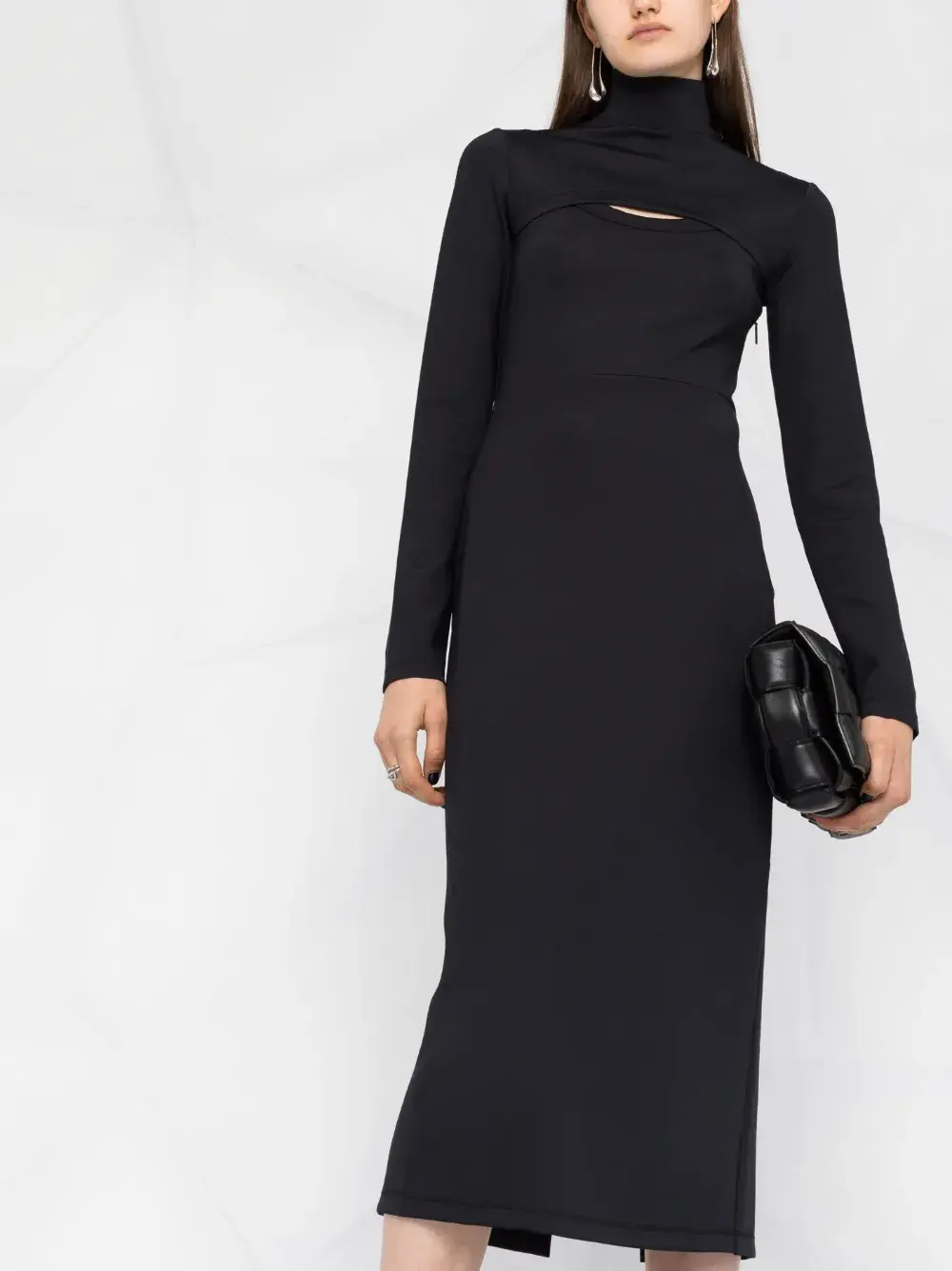 Высокий воротник, вырезные детали, длинные рукава и длина миди. Цвет: черный.