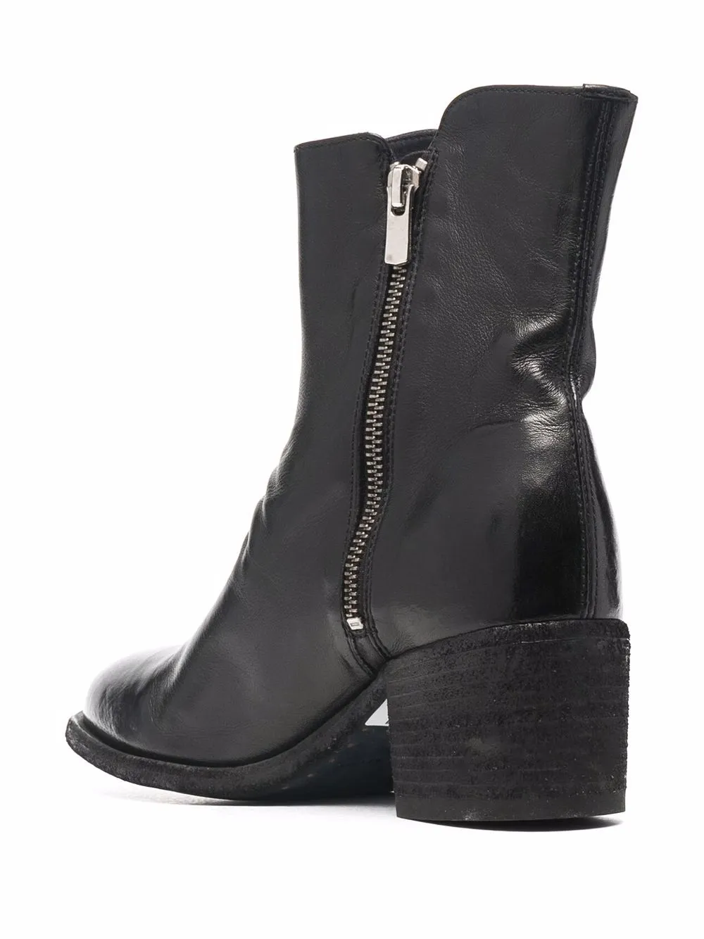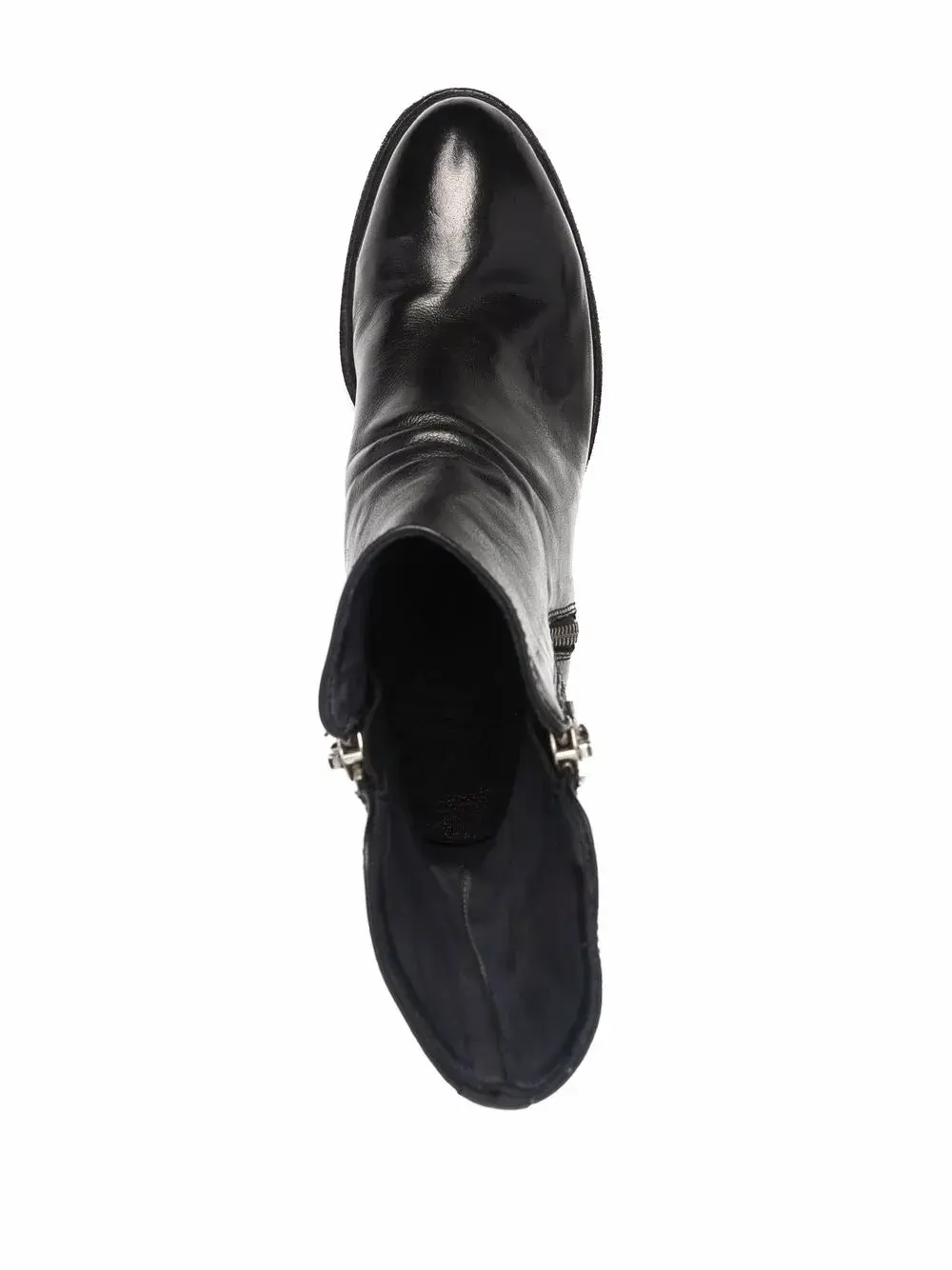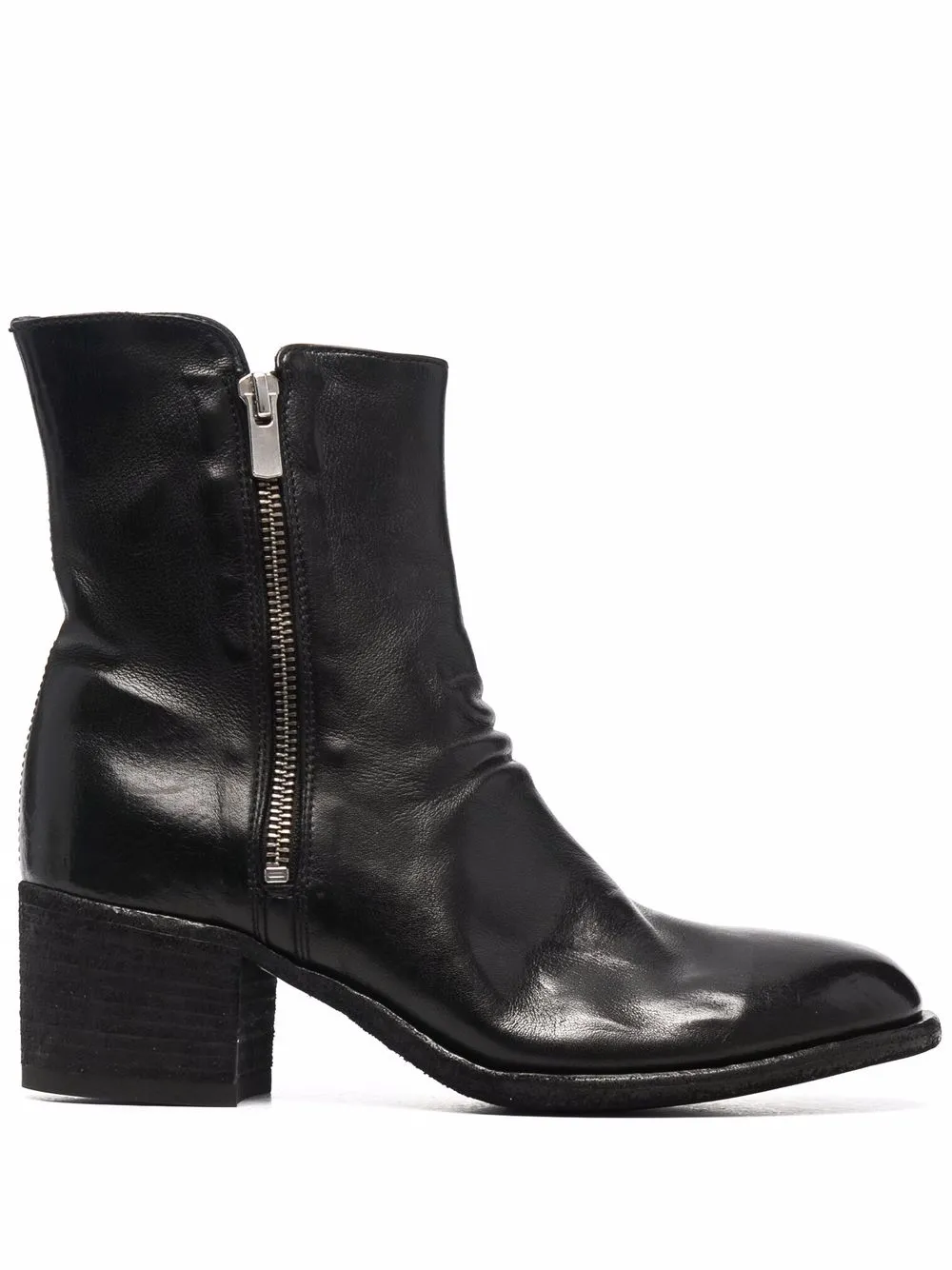 Глянцевая фактура, миндалевидный носок, длина по щиколотку, застежка на молнии сбоку и низкий блочный каблук. Цвет: черный.