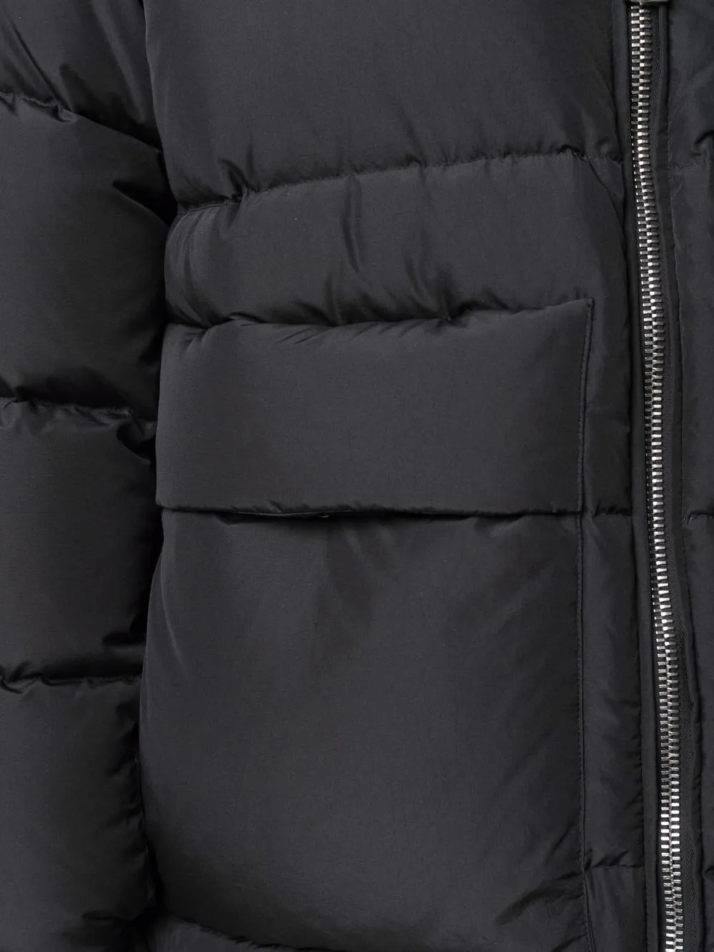 Наполнитель из смеси пуха и пера, дутый материал, детали с молниями, высокий воротник, двусторонняя молния спереди, передние карманы с клапаном, приспущенные плечи, длинные рукава и эластичные манжеты. Цвет: черный.