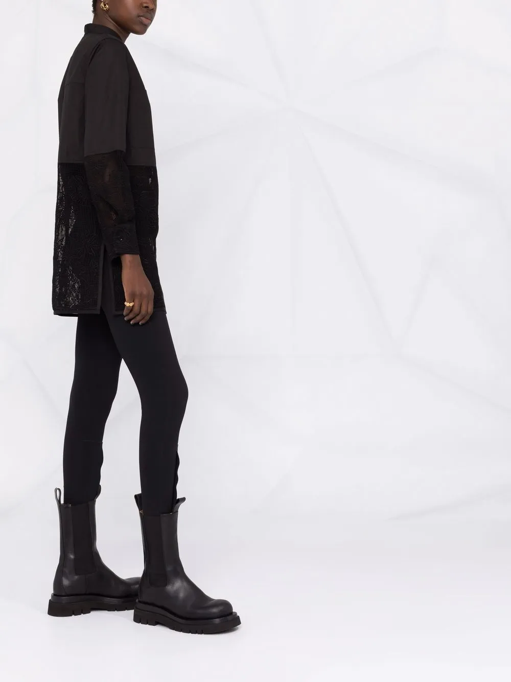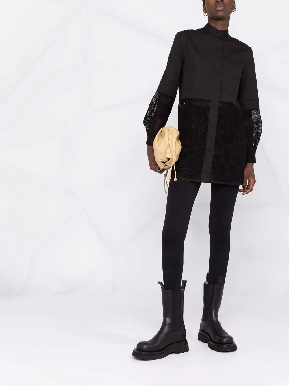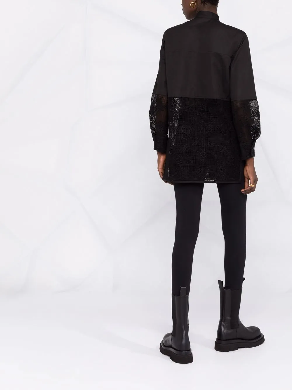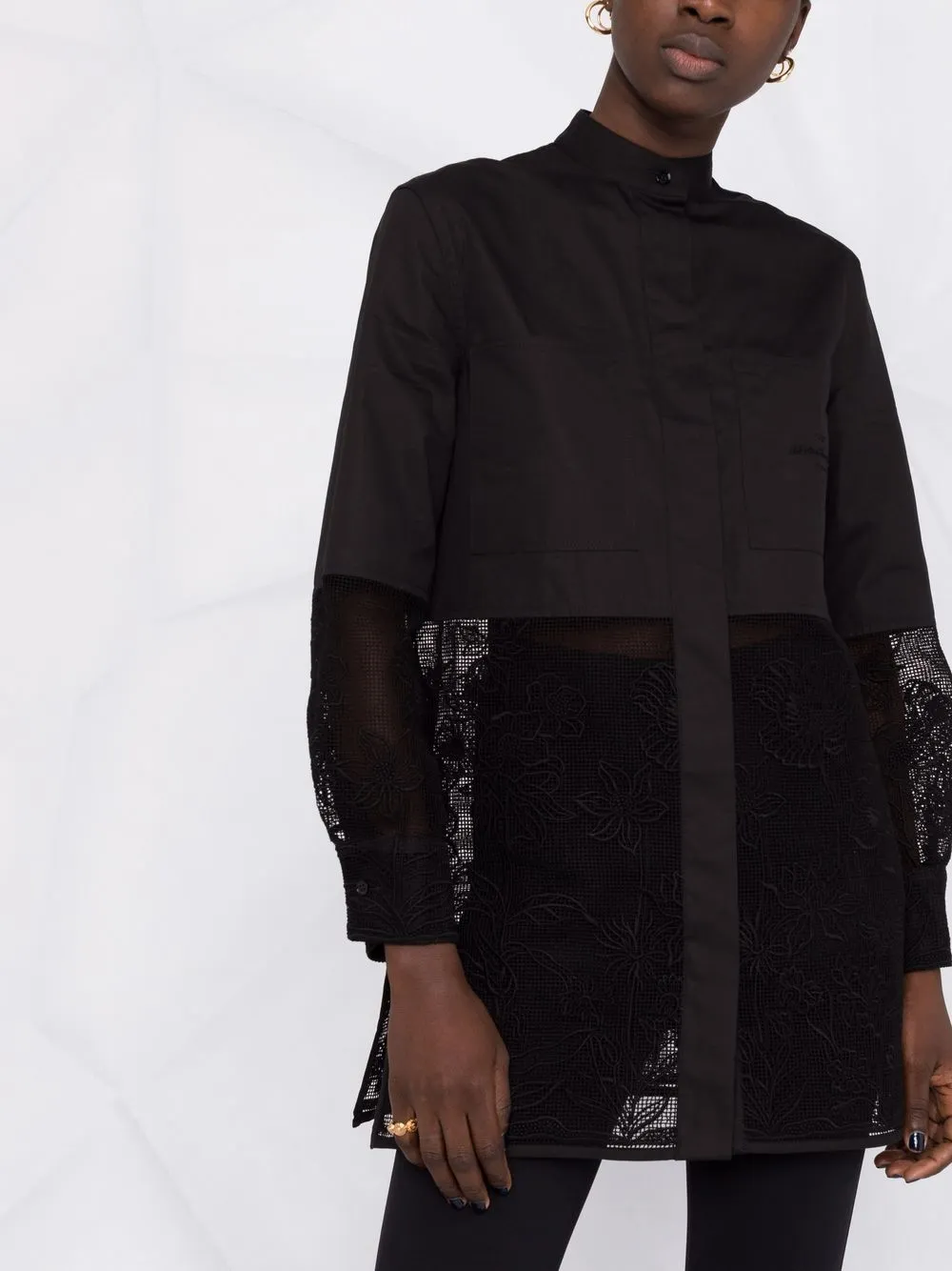 Кружевные вставки, воротник-стойка, потайная застежка спереди, два накладных кармана на груди, длинные рукава, манжеты на пуговицах и прямой подол. Цвет: черный.