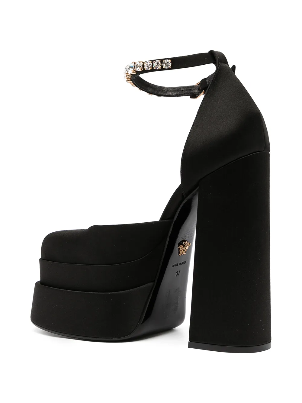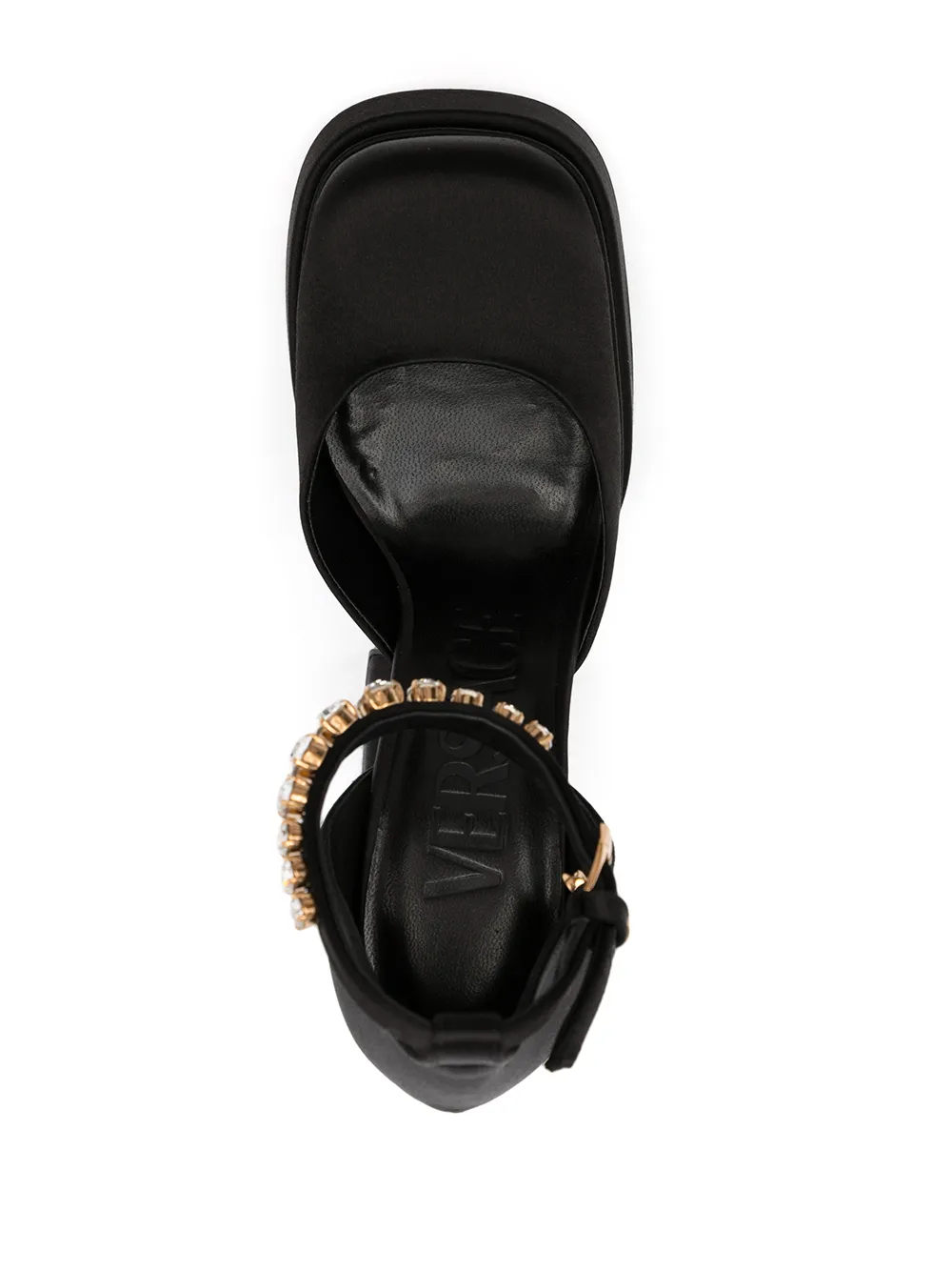 Сатиновая фактура, узор Medusa Head, украшения из горного хрусталя, кожаная стелька с логотипом, ремешок на щиколотке с пряжкой, подошва на платформе и высокий блочный каблук. Цвет: черный.