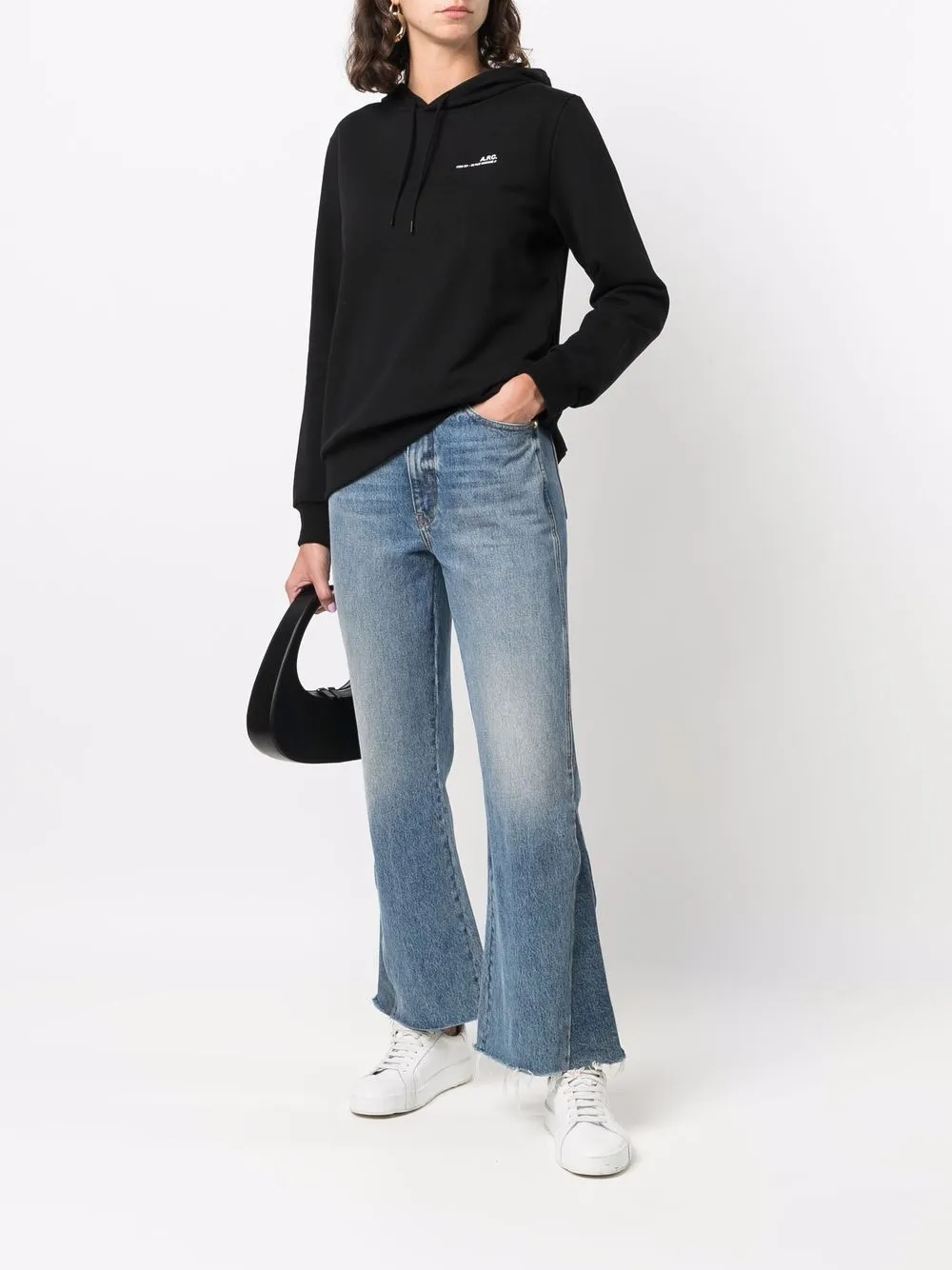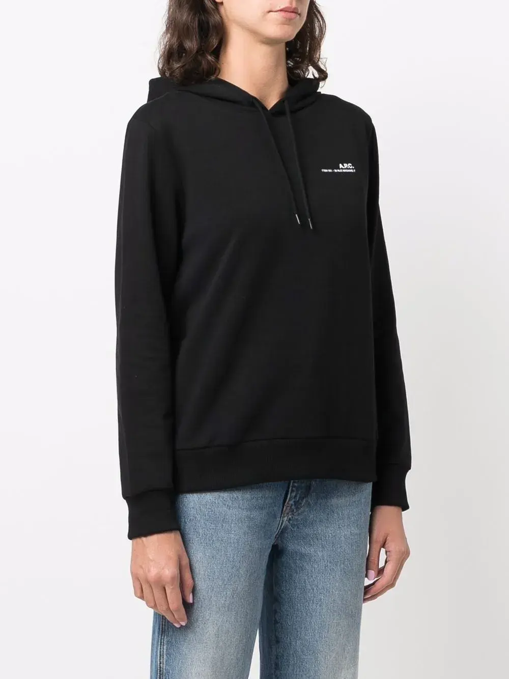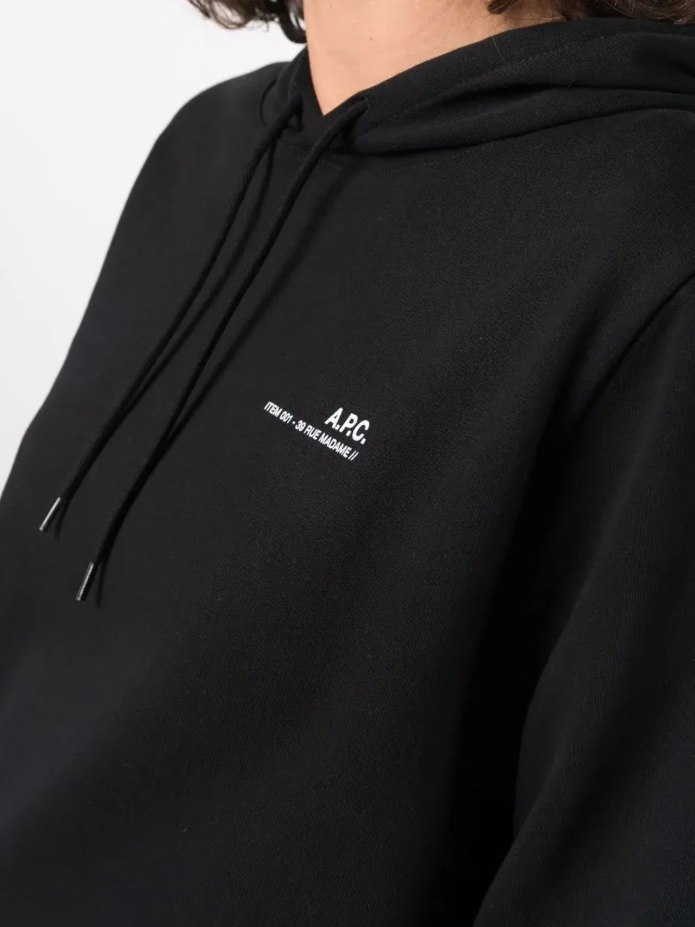 Флисовый материал, принт с логотипом на груди, затягивающийся на шнурок капюшон, длинные рукава и прямой подол.