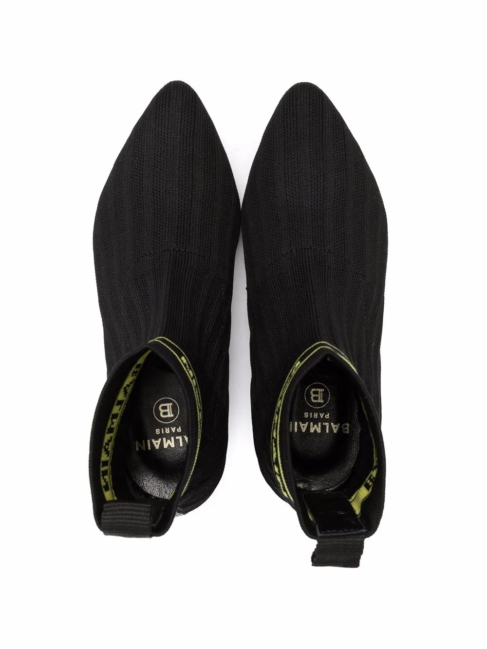 Миндалевидный носок, трикотажный материал, логотип в технике интарсия, стелька с логотипом, длина по щиколотку и низкий каблук.