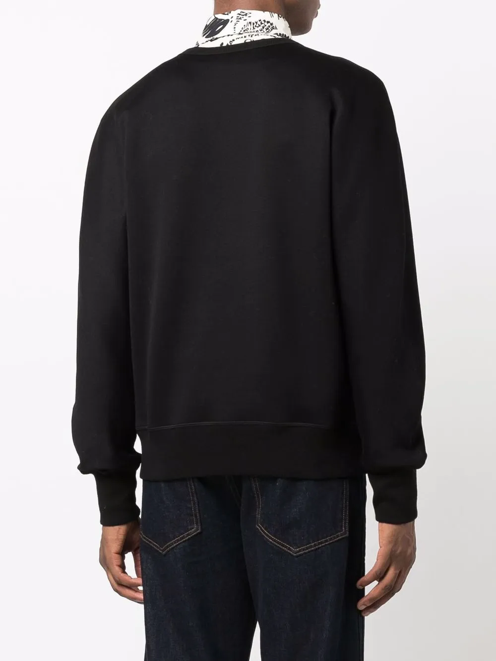 Нашивка с логотипом спереди, круглый вырез, края в рубчик и длинные рукава.