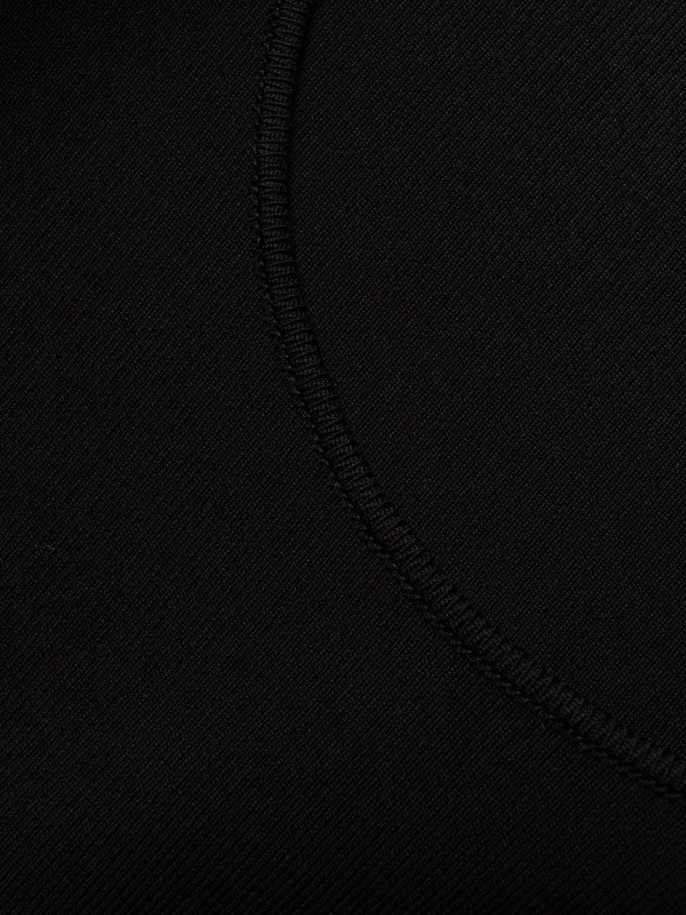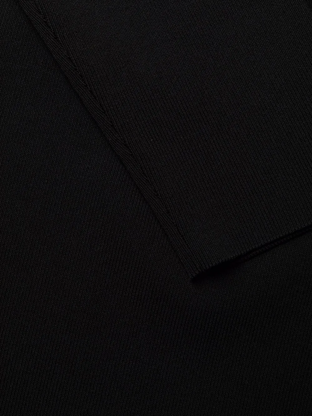 U-образный вырез, рукава три четверти, асимметричный подол и длина выше колена. Цвет: черный.