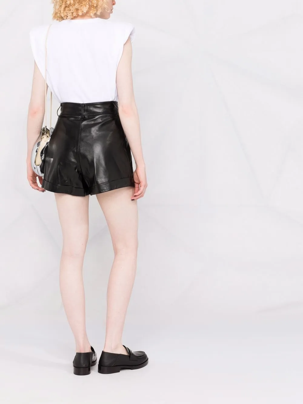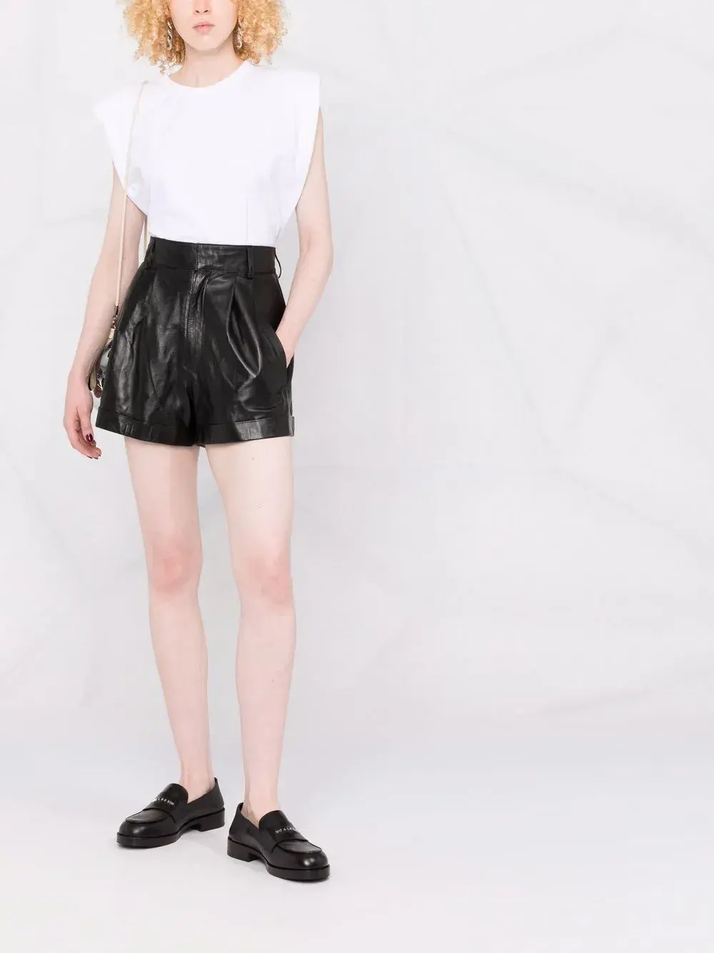 Плиссировка, завышенная линия талии, петли для ремня, подвороты и два кармана по бокам. Цвет: черный.