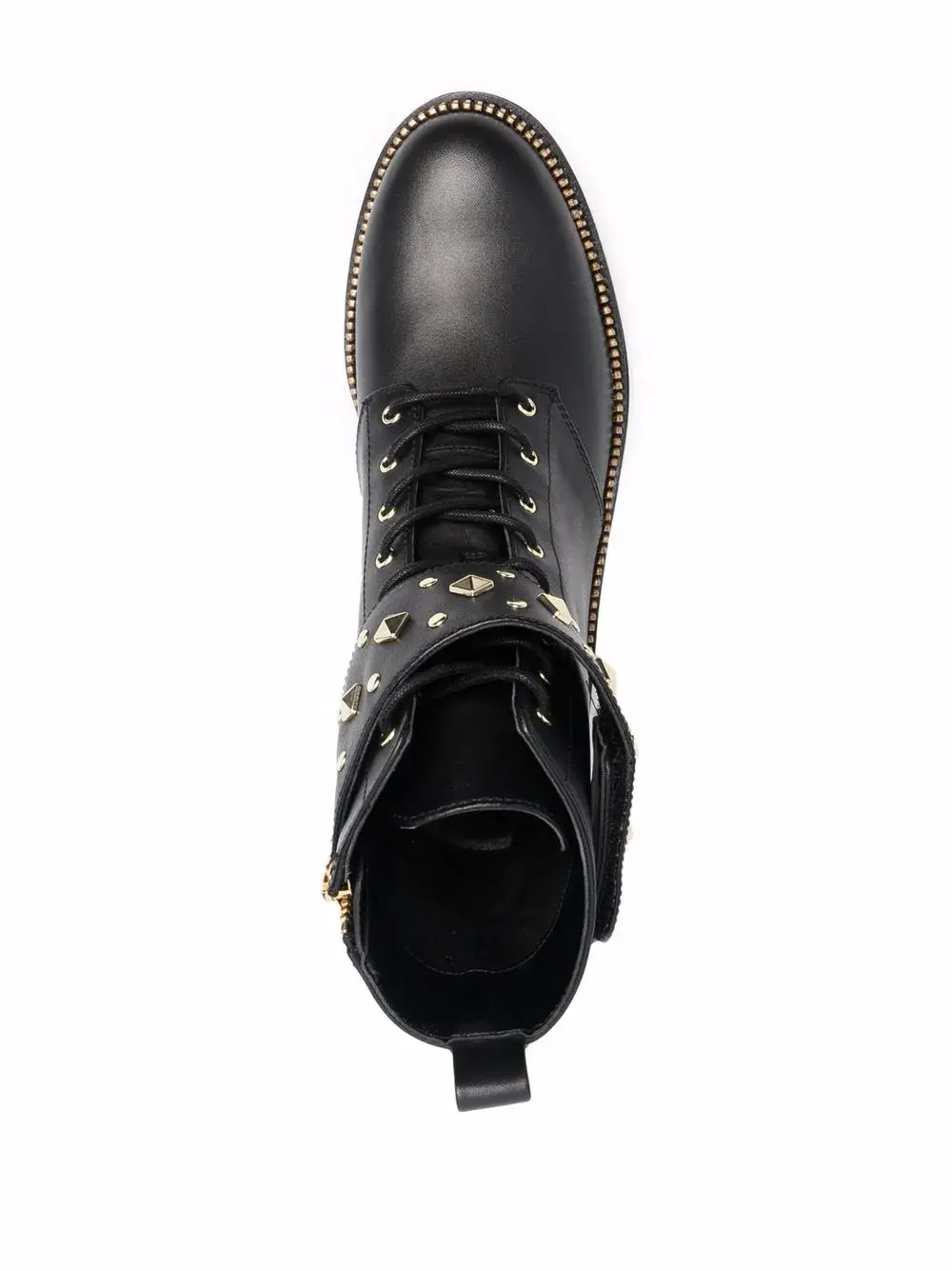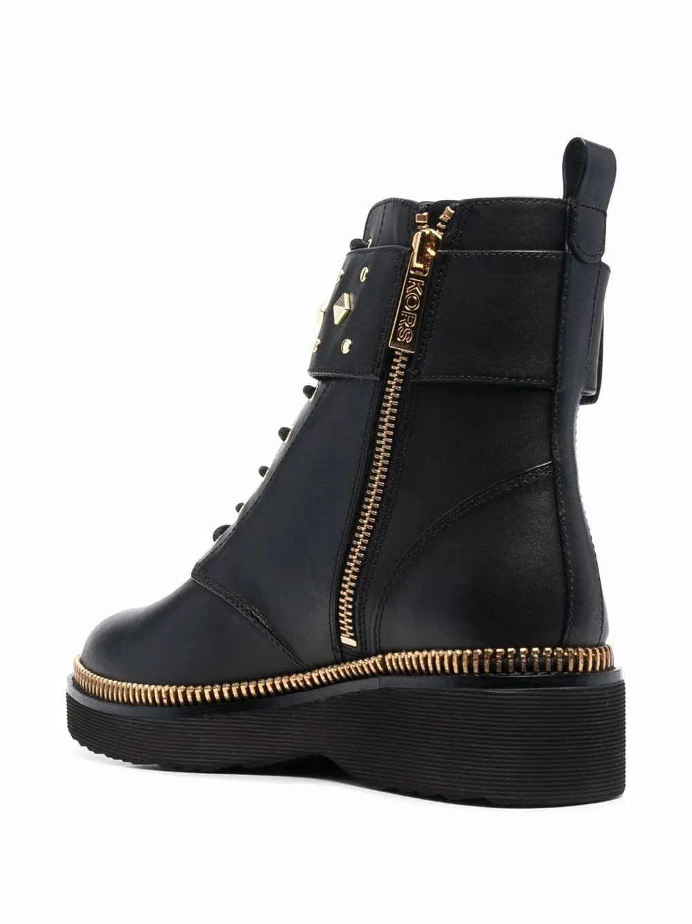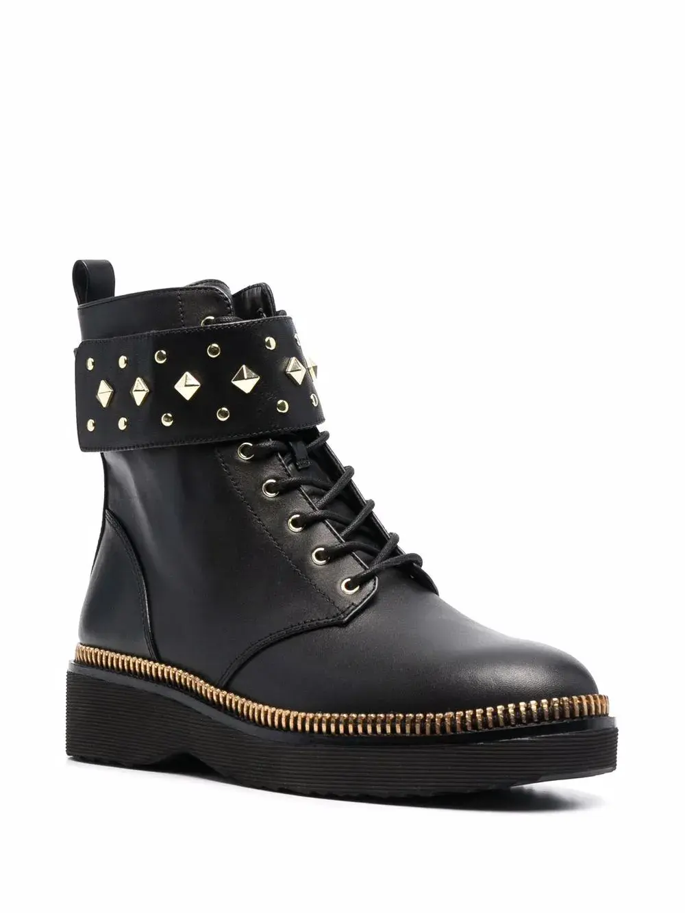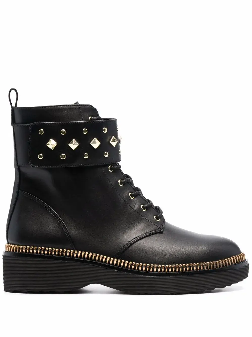 Заклепки-шипы, контрастная строчка, закругленный носок, шнуровка спереди, рифленая резиновая подошва, застежка на молнии сбоку и петля для подтягивания сзади. Цвет: черный.