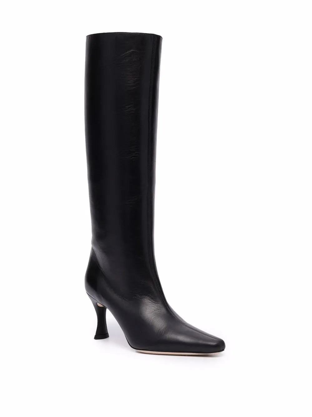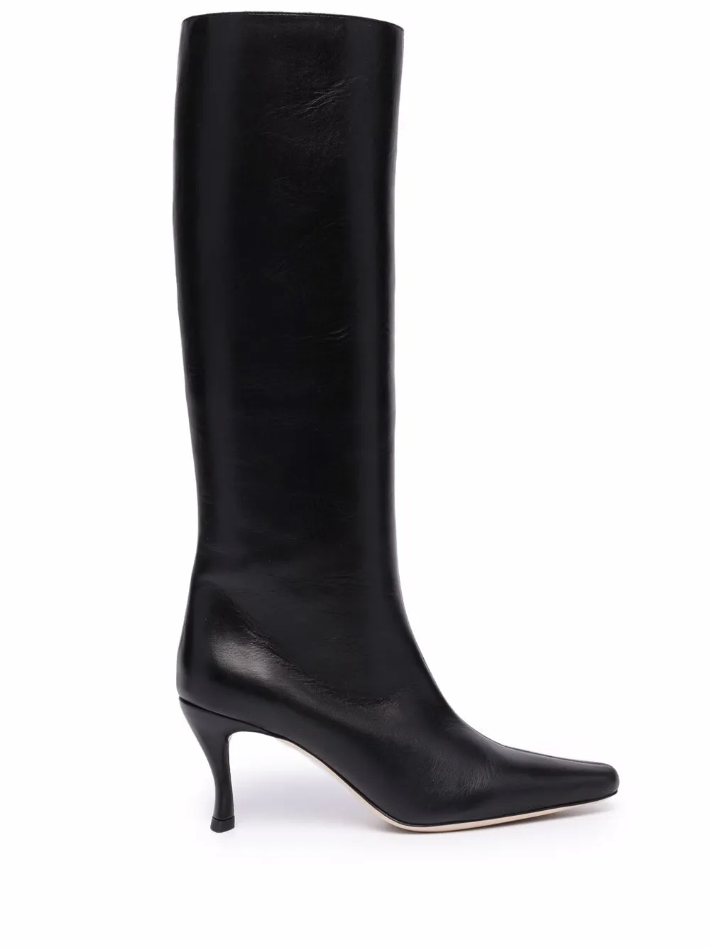 Длина по колено, заостренный носок и низкий каблук. Цвет: черный.