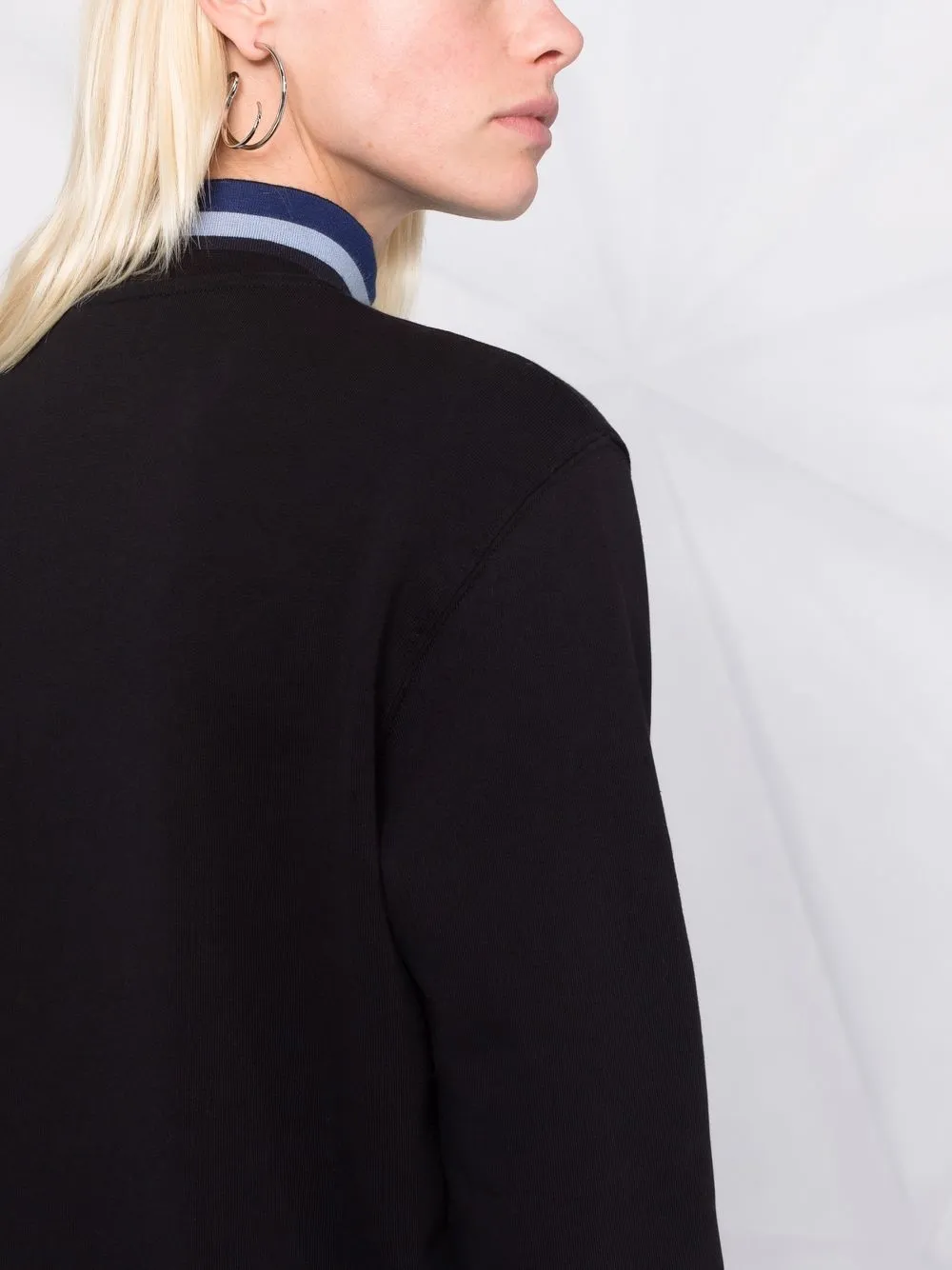 Принт с логотипом на груди, круглый вырез, длинные рукава, манжеты в рубчик и подол в рубчик.